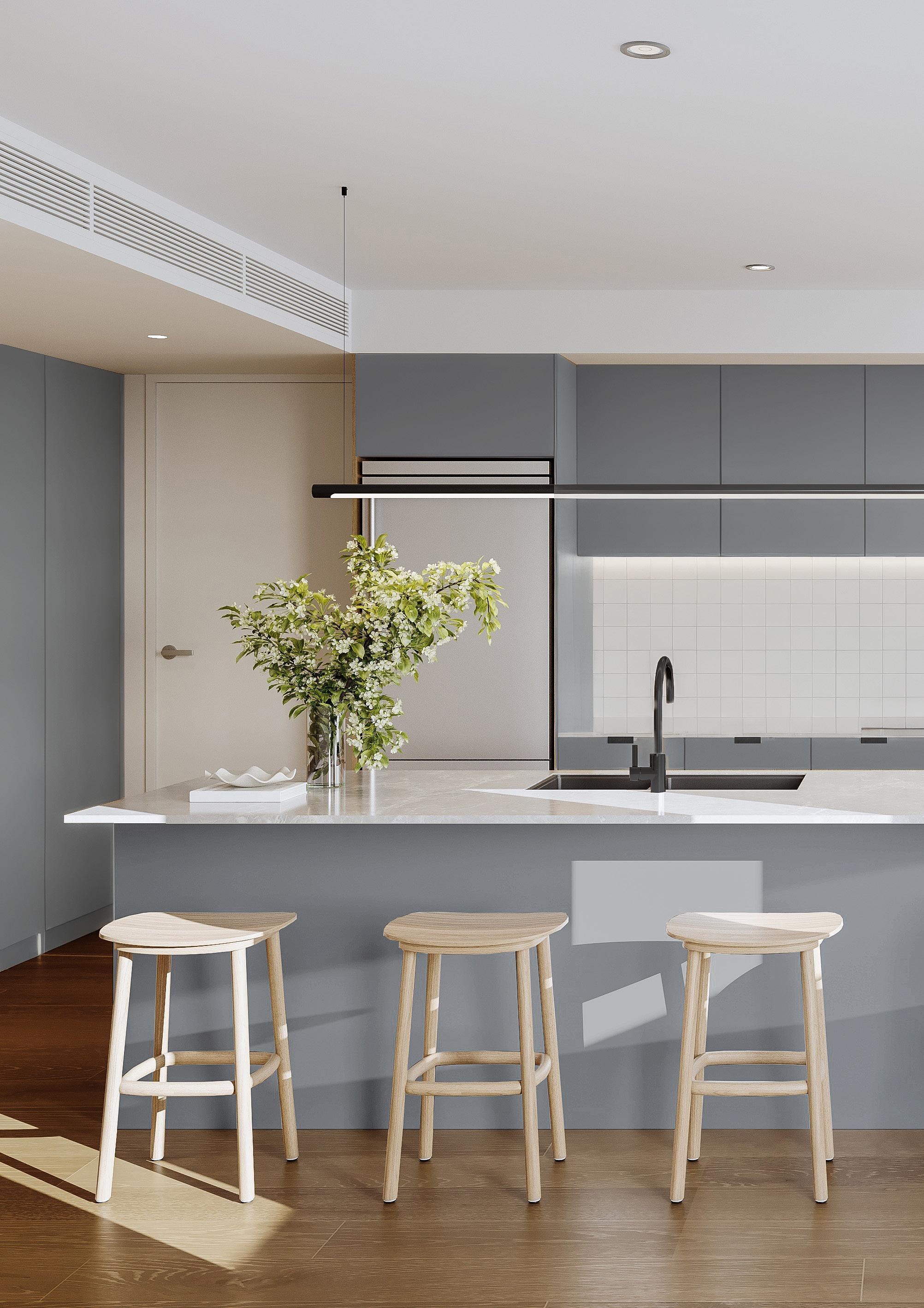 Open-plan living areas invite connection, with choice of natural timber tones or a grey /green polytec cabinetry and stone finishes, soft lighting creating a refined yet welcoming atmosphere. The kitchen is designed for effortless entertaining, featuring Smeg appliances