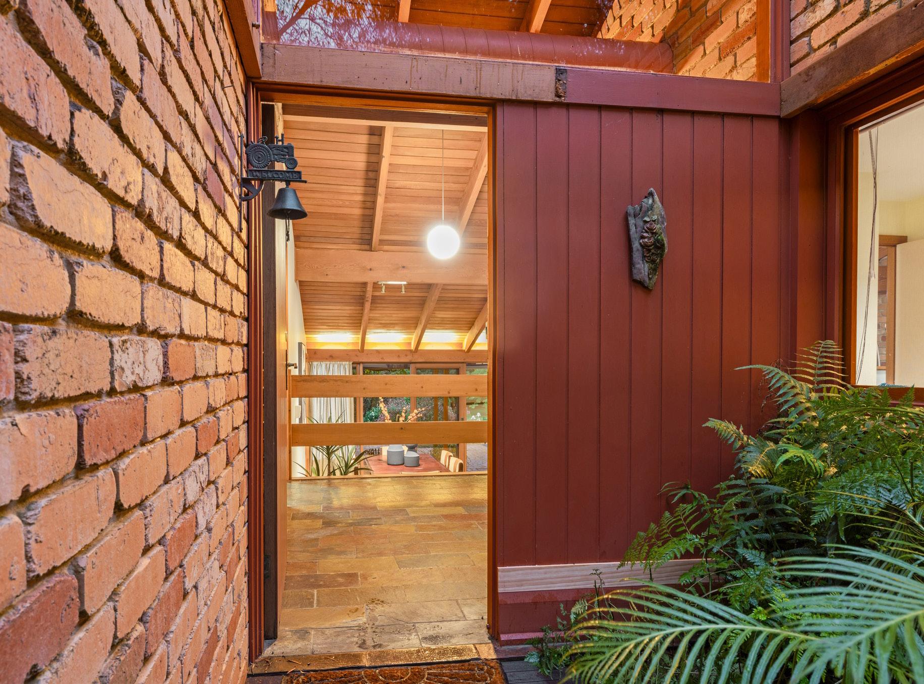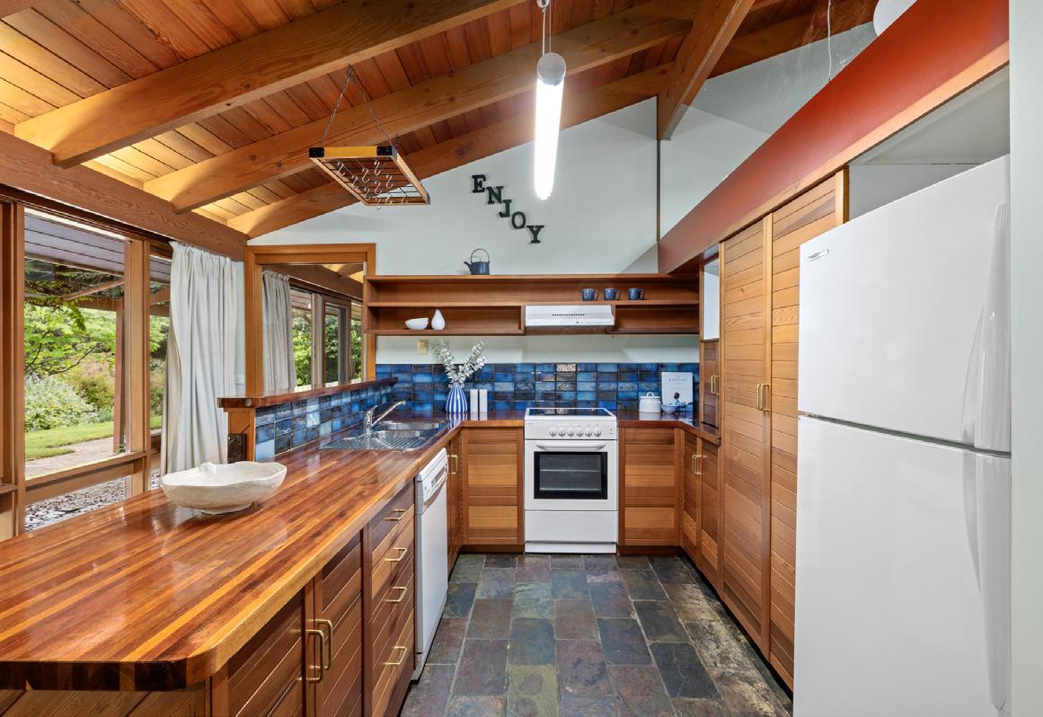 Inside, the home reflects the charm and character of the 1980s, with pitched ceilings, exposed beams, slate flooring, and internal brick walls that create a warm and inviting atmosphere. The layout is thoughtfully designed to suit a range of lifestyles, offering distinct living zones that include a formal dining area and a spacious lounge with an open fireplace. Large sliding doors open directly to the garden, inviting the outdoors in and framing the picturesque views.