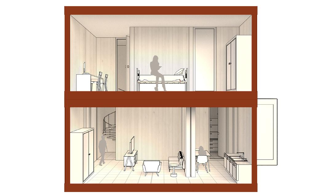 Questa casa è pensata per due studenti; per questo motivo sono stati utilizzati solo moduli small, in quanto ho immaginato una vita prevalentemente fuori casa.