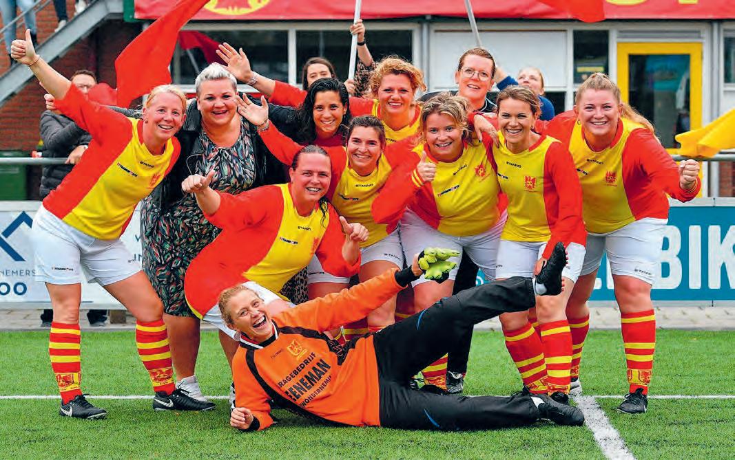 zijn we terug door ons rood-gele hart.” Ondertussen zijn Frederike en Marieke aangeschoven. “We zijn een hecht vriendinnenteam en delen lief en leed met elkaar. Trouwerijen, de geboorten en het dopen van onze kinderen en het delen van verdriet met elkaar hoort hier ook bij”, vult Frederike aan. “Ik rijd er iedere keer zelfs voor uit Garderen hiernaartoe”, zegt Marieke. “En bijzonder is dat de leeftijden binnen het team best uit elkaar liggen tussen de 30 en 46 jaar. We hebben veel plezier met elkaar en niet alleen op het voetbalveld. Weekendjes weg, gezellige avonden of samen meedoen met een ander sportief evenement hoort daar ook bij.”