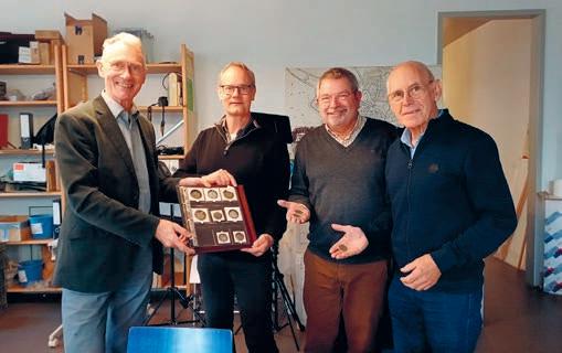 Nazaten van bakker Jan Kelderman - Jan Willemsen, Harm Kelderman en Jan Kelderman - overhandigen de elf munten van de muntschat aan Michel Groothedde, stadsarcheoloog op 9 november 2023. Het boek over de schatvondst is deze week verschenen. (Foto: Erfgoedcentrum Zutphen)