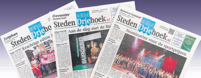 Postbus 638, 7300 AP Apeldoorn Kantoor, redactie en administratie: Asselsestraat 140, 7311 ET Apeldoorn. Tel. 055 - 5219878 verkoop@stedendriehoek.nl redactie@stedendriehoek.nl www.stedendriehoek.nl Klachten bezorging: 055 - 303 4901 klachten@stedendriehoek.nl Volg ons ook op: M N S V P