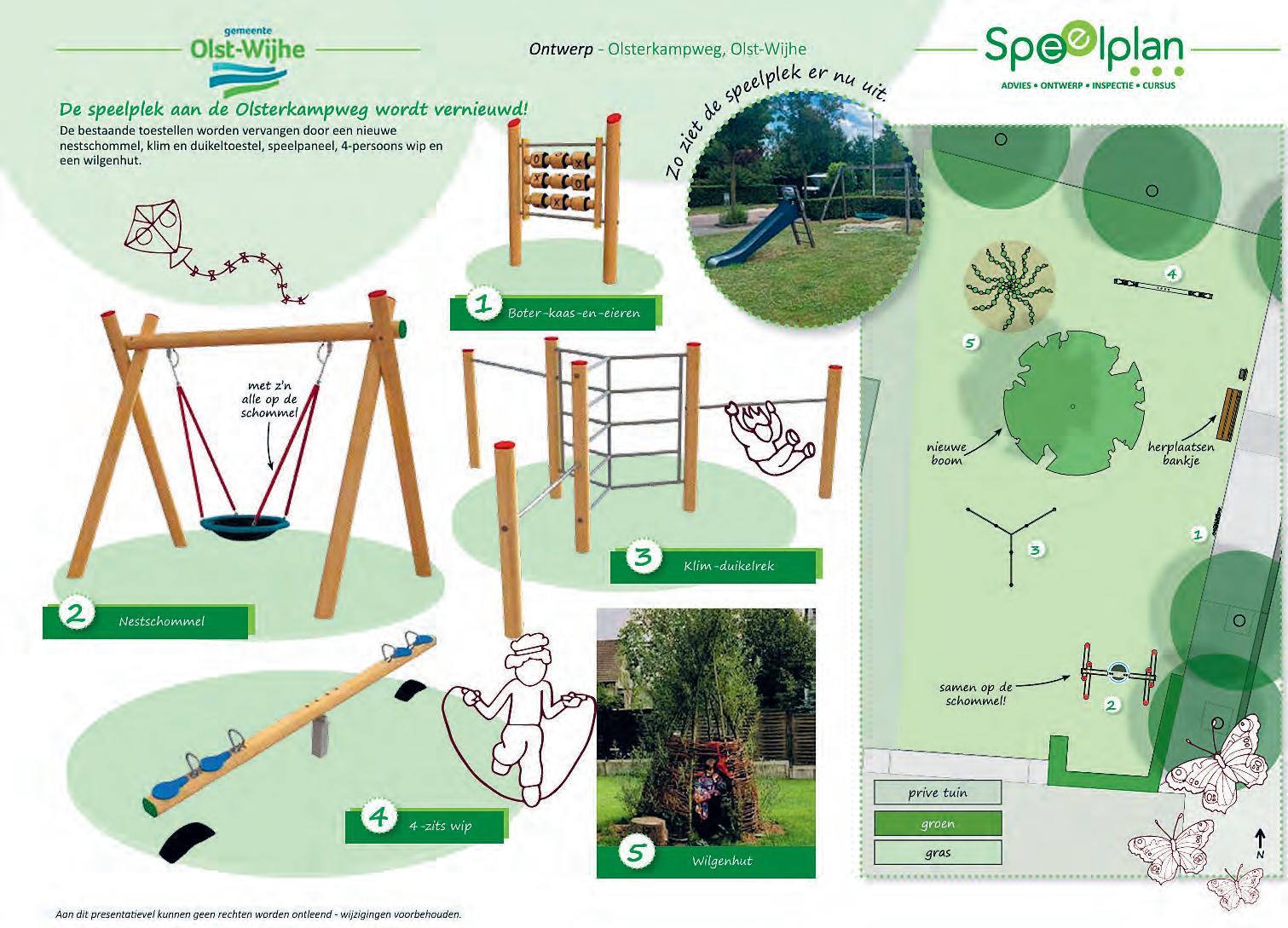 De nieuwe speelelementen zijn besteld en worden naar verwachting dit jaar nog geplaatst. In het nieuwe jaar bekijkt de gemeente welke andere speelplekken vernieuwd kunnen worden in de gemeente Olst-Wijhe.