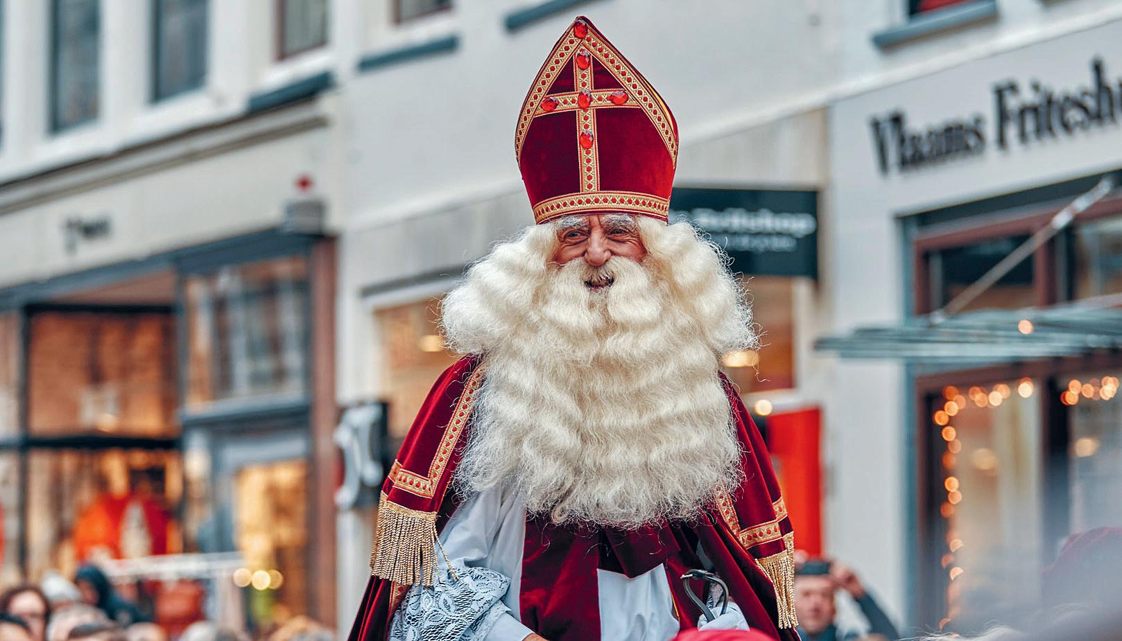 vergezeld door de Pieten, op zijn schimmel Ozosnel vrien delijk naar de kinderen zal zwaaien.