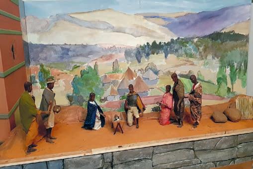 En het is niet zomaar een stalletje waar de groepen naar komen kijken. De halve kerk, 400 vierkante meter, is omgetoverd in een verhaal dat begint bij de engel Gabriel. Bezoekers lopen langs de huizen van Nazareth en Bethlehem, waar ze naar binnen kunnen kijken.