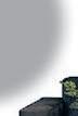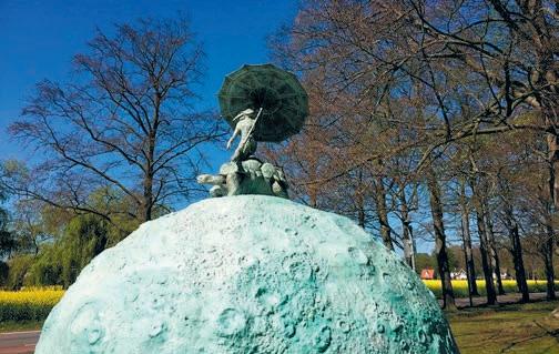 ook een relatie heeft met de kosmos. De trage schildpad wordt gezien als de drager van het aardse bestaan. In een bekende fabel verliest de haas het in een wedloop van de schildpad. De haas zit hier met een elegante parasol op het schild loom in de zon. De haas is in veel oude culturen een ‘maandier’. De grote bol raakt het grasveld maar net en lijkt zo weg te kunnen rollen als de schildpad begint te lopen.