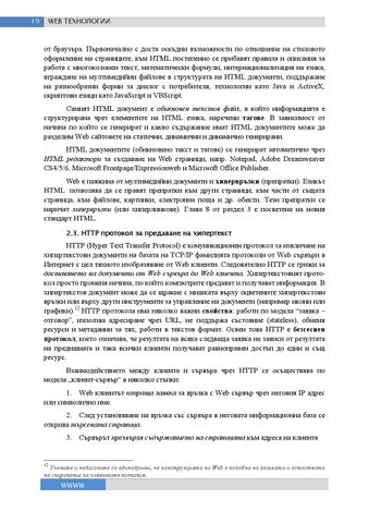 от браузъра. Първоначално с доста оскъдни възможности по отношение на стиловото оформление на страниците, към HTML постепенно се прибавят правила и описания за работа с многоколонен текст, математически формули, интернационализация на езика, вграждане на мултимедийни файлове в структурата на HTML документи, поддържане на разнообразни форми за диалог с потребителя, технологии като Java и ActiveX, скриптови езици като JavaScript и VBScript. Самият HTML документ е обикновен текстов файл, в който информацията е структурирана чрез елементите на HTML езика, наречени тагове. В зависимост от начина по който се генерират и какво съдържание имат HTML документите може да разделим Web сайтовете на статични, динамични и динамично генерирани. HTML документите (обикновено текст и тагове) се генерират автоматично чрез HTML редактори за създаване на Web страници, напр. Notepad, Adobe Dreamweaver CS4/5/6, Microsoft Frontpage/Expressionweb и Microsoft Office Publisher. Web е паяжина от мултимедийни документи и хипервръзки (препратки). Езикът HTML позволява да се правят препратки към други страници, към части от същата страница, към файлове, картинки, електронна поща и др. обекти. Тези препратки се наричат хипервръзки (или хиперлинкове). Глава 8 от раздел 3 е посветена на новия стандарт HTML. 2.3. HTTP протокол за предаване на хипертекст