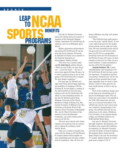 ference affiliation may help with student recruitment. “The NAIA has been really good to us over the years,” said Dr. Knorr. “It was a very viable institution for the smaller, private schools, and we made our niche there. We were nationally known and all the sports did very well. On the other hand, the NCAA is so recognizable. Everybody knows the NCAA because of the Division I teams. Of course, we don’t compete at that level, but when we go to recruit students, it means something to say they will be NCAA athletes.” Amanda Smitheal, ’00, a senior volleyball player, said competing at the NCAA Division II level has been a positive experience. “Competition has been very spirited,” Smitheal said. “So far, our games are better attended than in past years, especially when we travel to other schools. I think it’s been good for our team overall because we had to step up our play.” News of the conference change came on the heels of an outstanding year of play by the Hilltopper teams. The university sent seven teams to the playoffs in the 1998-1999 school year, and four went on to national tournaments. The softball team and the men’s tennis team won conference championships in the spring. The softball team beat the topranked team in the nation, Oklahoma City University, in the regional championships, and finished seventh at the NAIA Softball World Series. Last year, St. Edward’s University had eight Academic All-Americans, and 64 athletes were named All-Conference for academics. St. Edward’s University won both the Heart of Texas Conference All-Academic Sports Award and AllSports Trophy. Last year, the university’s 177 student athletes boasted an overall grade point average of 3.02. ■