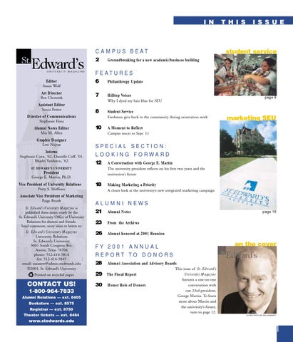 St. Edward’s University Magazine is published three-times yearly by the St. Edward’s University Office of University Relations for alumni and friends. Send comments, story ideas or letters to: St. Edward’s University Magazine University Relations St. Edward’s University 3001 South Congress Ave. Austin, Texas 78704 phone: 512-416-5814 fax: 512-416-5845 email: susanew@admin.stedwards.edu ©2001, St. Edward’s University