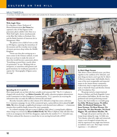St. Idiot’s Magic Vacuum Take about a dozen talented actors, put them together in the cauldron of St. Edward’s, and next thing you know, you’ve got the St. Idiot’s Collective acting troupe. Individually, they’re some of the most recognizable and respected names in the Austin theater community. Collectively, they’ve staged radical projects such as Vaudeville Vanya and Rainbow Family of the Serendipitous Now. The group started as improvisational theater in Robert and Pearle Ragsdale Center and residence hall lobbies. By the time they graduated and started performing around Austin, they had swollen to a veritable gang: Lee Eddy, ’00; Jenny Larson, ’01; Jeffrey Mills, ’02; Elizabeth Wakehouse, ’02; Jason Newman, ’03; Brent Werzner, ’03; Aaron Clay, ’04; Alan Metoskie, ’04; David Higgins, ’05, and Adriene Mischler, ’06. Through side projects and day jobs, the troupe keeps taking the stage. As Eddy says, “Live theater, when all is right and connected, creates a sort of magical vacuum that can only be experienced one single time between an audience and a cast. That magic-vacuum experience — it’s addictive.”