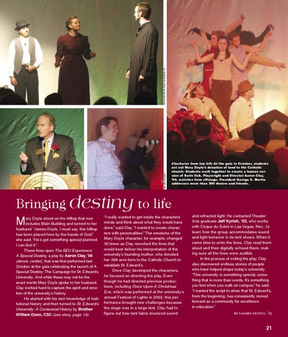 ary Doyle stood on the hilltop that now includes Main Building and turned to her husband. “James Doyle, I must say, this hilltop has been placed here by the hands of God,” she said. “He’s got something special planned. I can feel it.” These lines open The SEU Experience: A Special Destiny, a play by Aaron Clay, ’04 (above, center), that was first performed last October at the gala celebrating the launch of A Special Destiny: The Campaign for St. Edward’s University. And while these may not be the exact words Mary Doyle spoke to her husband, Clay worked hard to capture the spirit and emotion of the university’s history. He started with his own knowledge of institutional history and then turned to St. Edward’s University: A Centennial History by Brother William Dunn, CSC (see story, page 14).