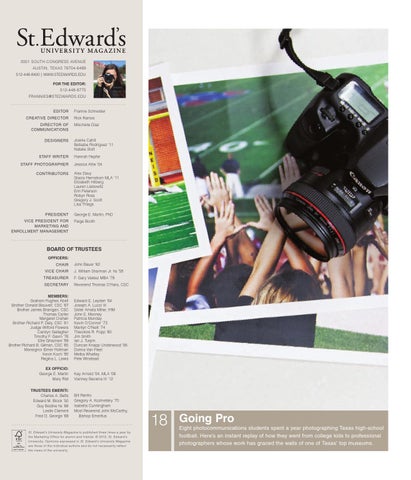 St. Edward’s University Magazine is published three times a year by the Marketing Office for alumni and friends. © 2012, St. Edward’s University. Opinions expressed in St. Edward’s University Magazine are those of the individual authors and do not necessarily reflect the views of the university.