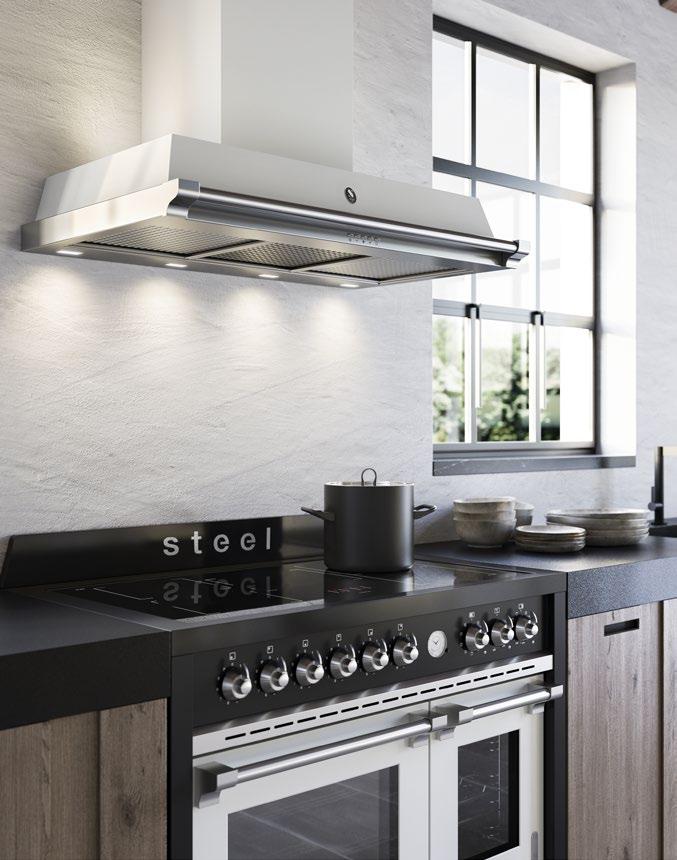 The newborn of Steel, Oxford collection is very romantic. Decoration and finishing are clearly visible, and soften the strong stainless-steel body matt black painted. An extended color range to emphasize the space, giving an ironic retro style. Oxford introduces range cookers and range hoods for every need, from recreating a country-chic space to break up a minimal interior design.