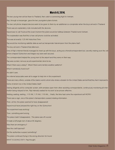 March 8, 2014. The two young men will be flown to Thailand, then catch a connecting flight to Vietnam. Raji, through a messenger, gave the two youngsters plane tickets. The two cell phone shaped devices were to be given to them by an additional co-conspirator when the boys arrived in Thailand. There was an explanatory note included with the devices. Sayed was to call Pouria at the exact moment the plane would be halfway between Thailand and Vietnam. The explanation was that this is how cell phone could be activated. This was at exactly 1:20 AM Indochina Time. Raji would be monitoring satellite data as well as transponder transmission from the plane itself. The boy arrived in Thailand that afternoon. One of Raji’s internet friends managed to meet up with the boys, acting as a friend/correspondent but, secretly making sure the cell phone shaped Gizma-tron and Magno-ray were well secured. The correspondent helped the young men to the airport and they were on their way. Raji was excited, nervous as all experimenters tend to be. What if there was a delay? What if there were terrible weather patterns? What if somebody found out? He didn’t care. His internet associates were all to eager to help him in this experiment. There are many others, outside of the Islamic world, whom also share a disdain for the United States and all that they feel it represents. Some of whom live in the United States itself! Staring diligently at his computer screen, with windows open from other assisting correspondents, continuously monitoring all information being relayed to him, Raji intensely waited for his work to be proven effective. Waiting, waiting, waiting,..1:10 AM, 1:15 AM, 1:16 AM,....finally, the time had come the experiment will WORK! There was a sign, one of the plane’s transponders ceased relating information. Then, at first, the plane seemed to have disappeared! Sayed must have pressed the right key on the Gizma-tron! The experiment was working! Then, something went wrong. The plane hadn’t disappeared. The plane was off course! It made a left angle turn of about 90 degrees. Was there an emergency? Was the craft hijacked? Did the authorities suspect something? The plane continued flying in the wrong direction for hours! WHAT IS GOING ON?!!! Raji thought. Steel Notes Magazine | 11
