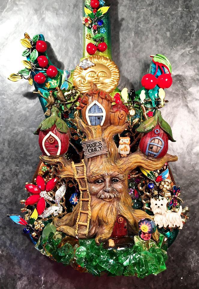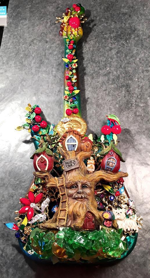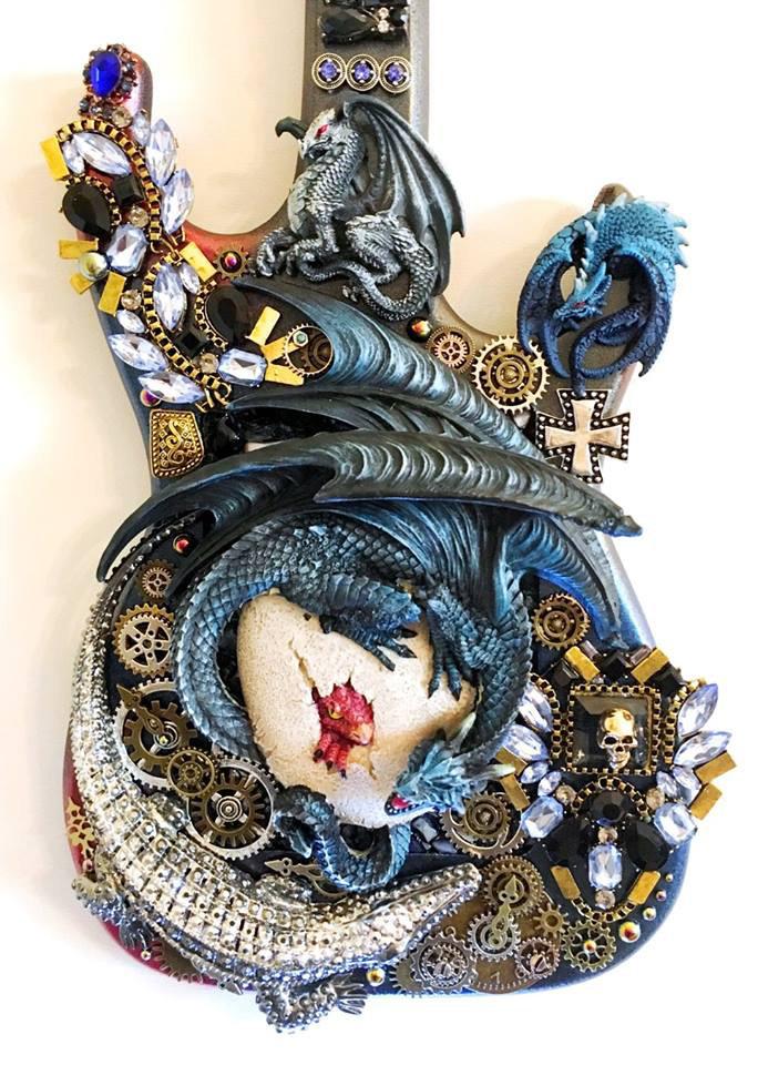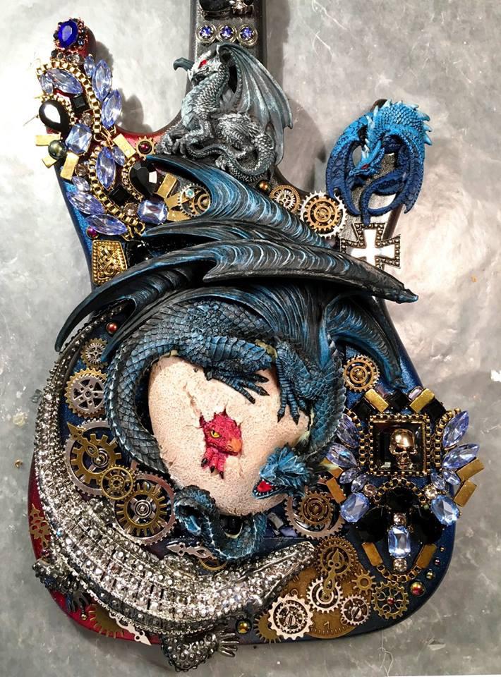Meet ‘Hatchling’, he is really an incredible AZURITE piece by ‘Pacific’ giftware. Marie started with a black back with a black, blue, orange and red front covered in gothic rhinestone pieces, dragons and steampunk gears throughout. She found an amazing silver alligator which was aged and distressed for the dark feel she was looking for and couldn’t be happier with the result.… A gothic steampunk alligator vs. dragon laden crazy large guitar which is hand cut by Steve Isaacs. Flippin’ SICK!!! Comes with a stand. 24”/8” $725