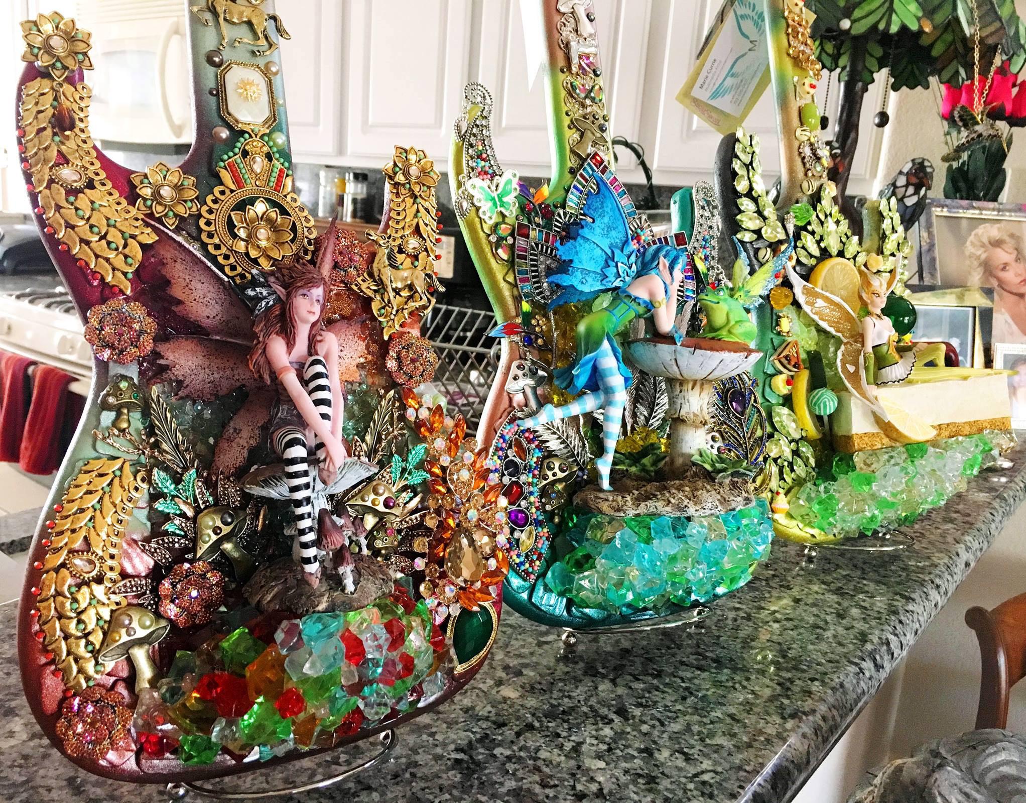 Meet~ ‘Enchanted Forest’ an adorable piece by Mini-World and you pixie lovers will get lost in the detail of this whimsical beauty. Marie started with a hunter green back with a green, yellow and orange front covered in abalone and used tons of metal cherries along with several vintage pieces with birds, dragonflies, suns, and rhinestone flowers. She placed him in a pool of multi colored sea glass with branches, clay toadstools, flowers ,plus leafs and built his cliff of green and gold ice along with a glass pathway and green sea glass. He took 3 days to complete and even these pics don’t come close to the beauty and fun of this adorable piece. He is hand cut from solid redwood by Steve Isaacs and 19”/7”. Comes with an easel stand! $600