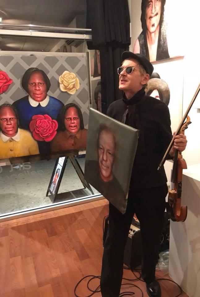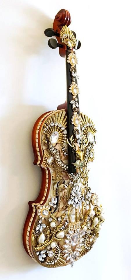 Meet ‘Crescendo’ Marie’s forth violin featuring a ½ Size solid wood Violin with a matte finish. She covered the front with gorgeous gold glittered and white opal abalone, plus added brass, gold, rhinestone, pearled vines, dragonflies and vintage pieces throughout. Marie was going for retro glamour with a vintage look right out of ‘The Great Gatsby’! Pyramid ribbing was added around the entire violin with the final piece, a deer head with brass antlers. A hook was added for wall hanging and this amazing piece will actually be delivered in her violin case along with the bow and easel stand. She is incredible!!!! $900