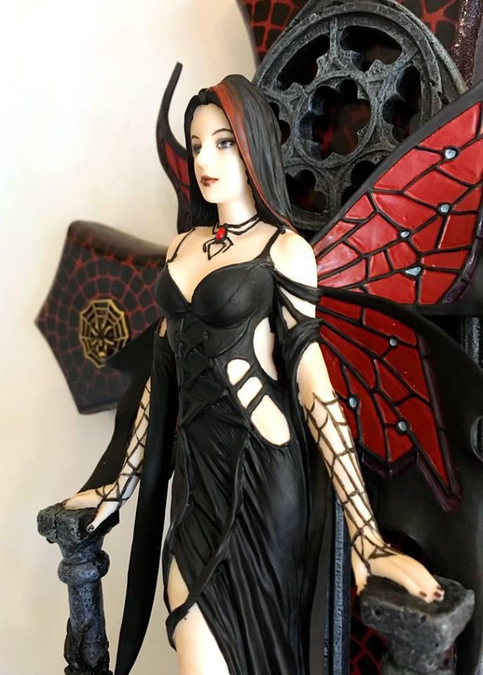 Meet~‘Arachnafaria’ by Anne Stokes which figurine alone was 9 in tall, 5 in long, 3 in deep. She is totally hand painted and her beauty boggles the mind! Marie knew she would be perfect for one of her NEW 22/12” wing tipped pine crosses by Steve Isaacs! She started with a black opal back with a red web pattern front finishing with a high gloss seal. The paint job alone took two days which was so worth the patience. Marie built her cliff of cherry red and black ice with chunks of black fire glass and red and black faceted crystals which was her true challenge. Brass spider webs were added here and there to preserve the beauty of the paint. She is remarkable…and very LARGE!! $475