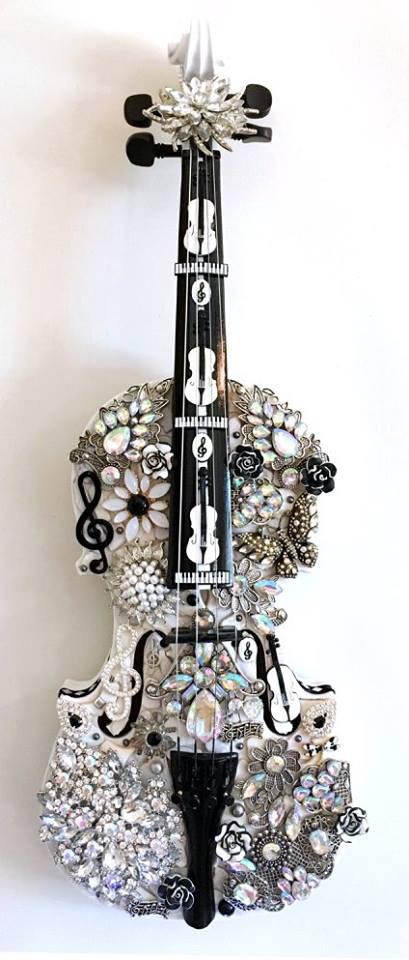 Meet~‘Strings’, an absolutely magnificent ½ size white maple violin! Marie started with white abalone and covered her in Swarovski Crystal, light Aurora Borealis, silver, rhinestone, notes, clefts, handmade clay flowers, pearls, and piano keys with mini violins throughout. She surrounded the piece in black and silver ribbing, and is her very 1st ‘stringed’ violin!!! She will be delivered in a case with her bow and also comes with a chrome stand. Pics will never come close to this beauty!