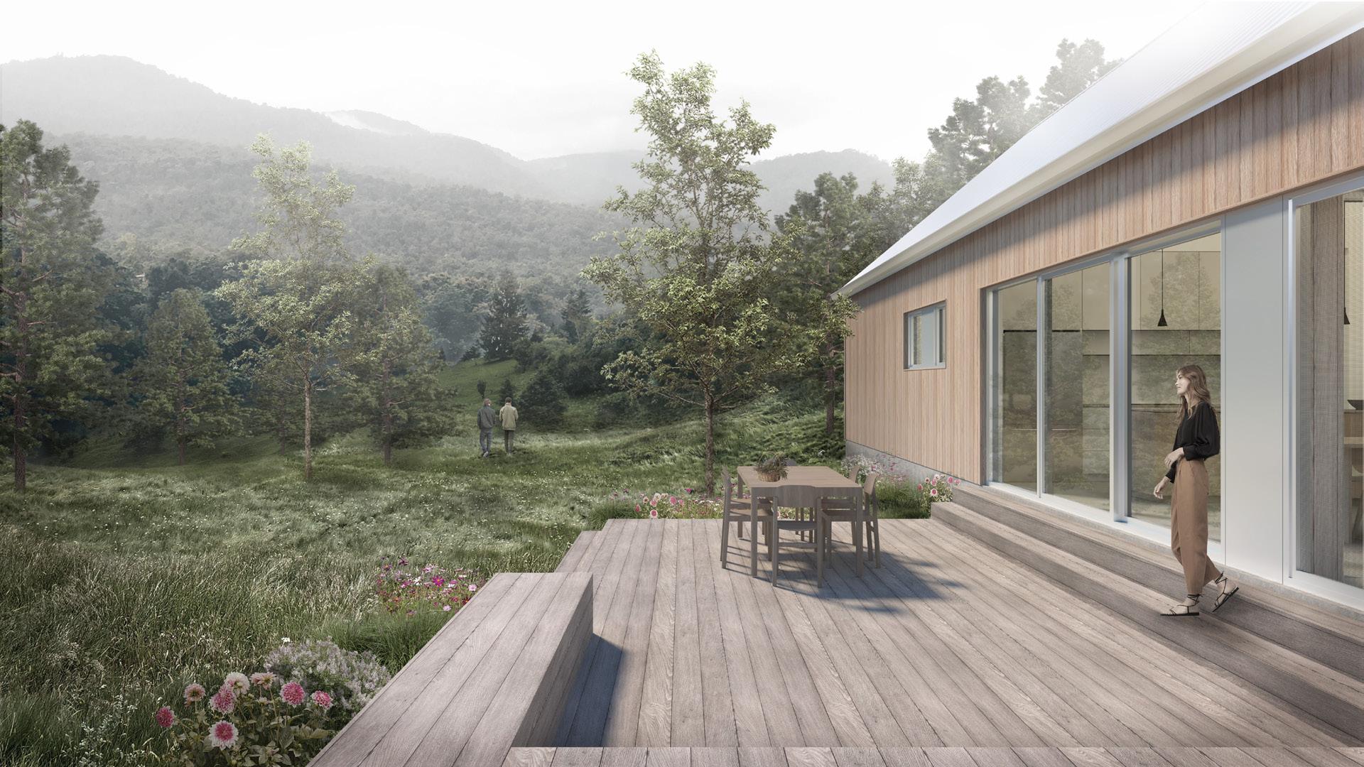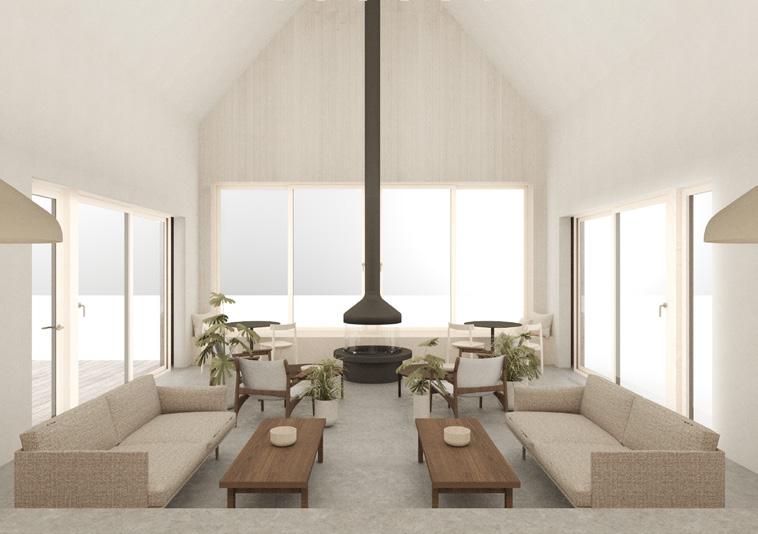 The project consists of several buildings that blend seamlessly into their environment, including a Nordic farm, a cafe-bar, fourseason A-frame cabins, and an outdoor activity base. Inspired by vernacular farm buildings, the cafe is at the heart of the project and the activities offered on site. Inside, there’s a small market and shop, where seasonal fresh produce grown on site are available as well as other goods such as cheeses, craft beers and wines from local producers.