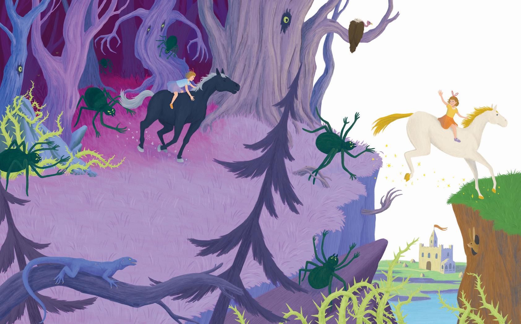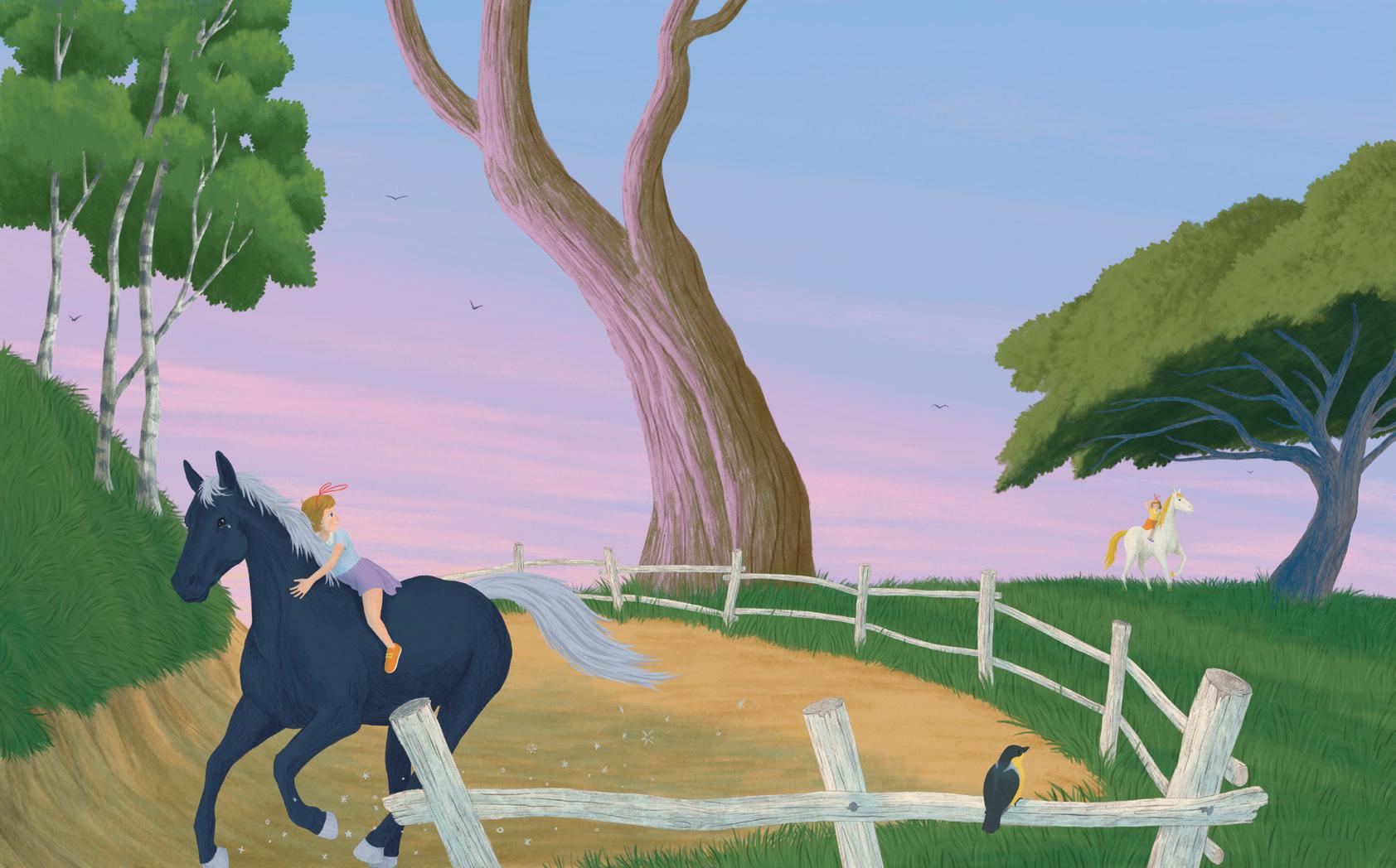Sono balzata a cavallo e sono scappata via, le lacrime mi rigavano le guance. Ho cavalcato il più veloce possibile. Lilla-li mi ha inseguito con il suo cavallo. Abbiamo galoppato così forte che Piè d’Oro e Piè d'Argento erano tutti sudati quando siamo arrivati al Salone Dorato.