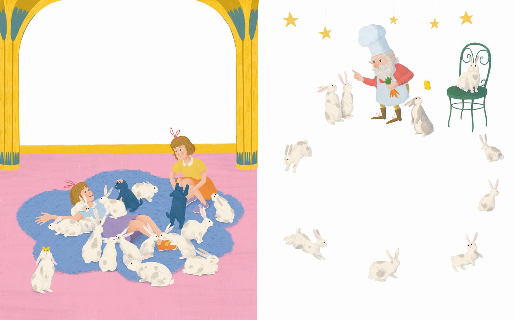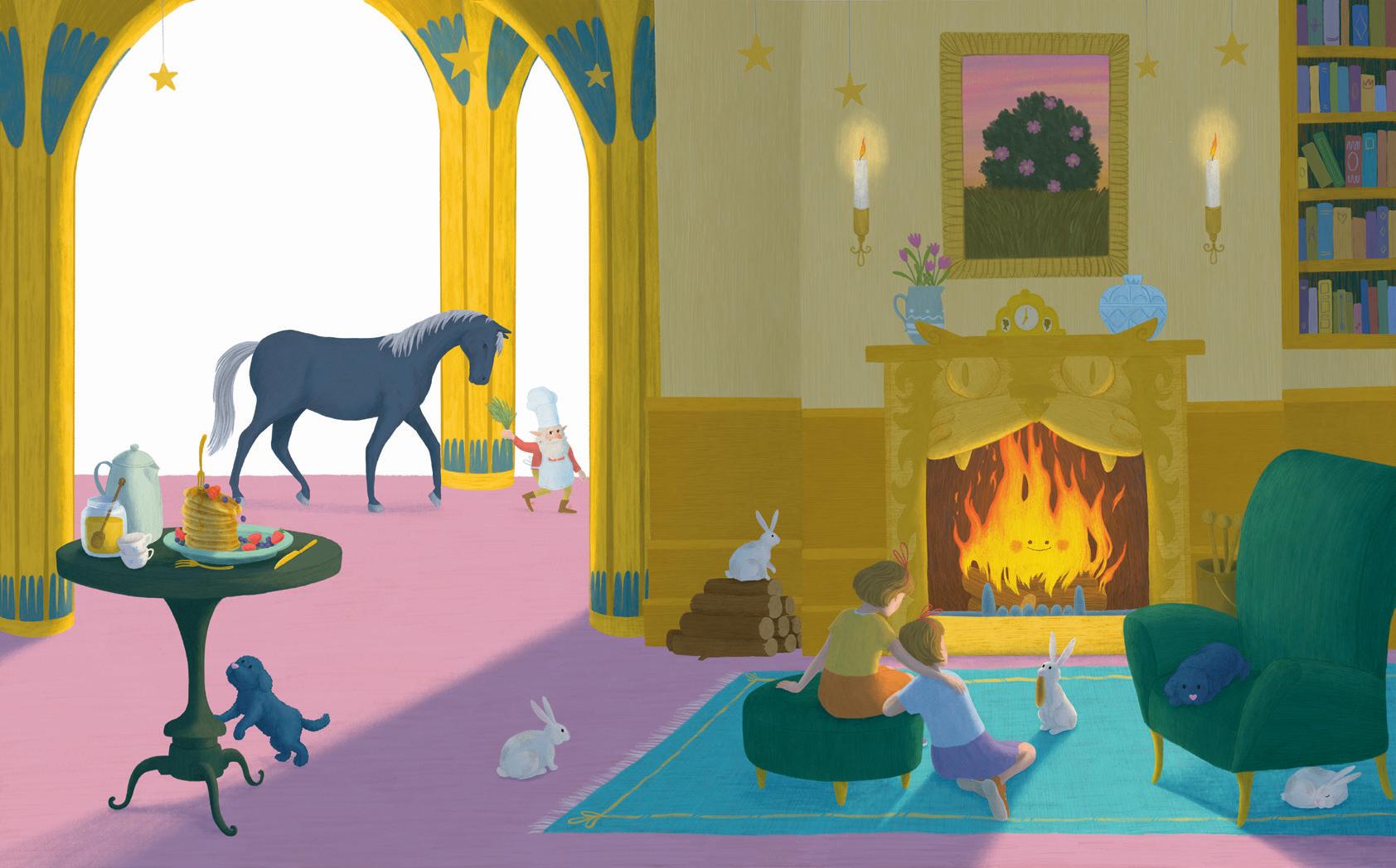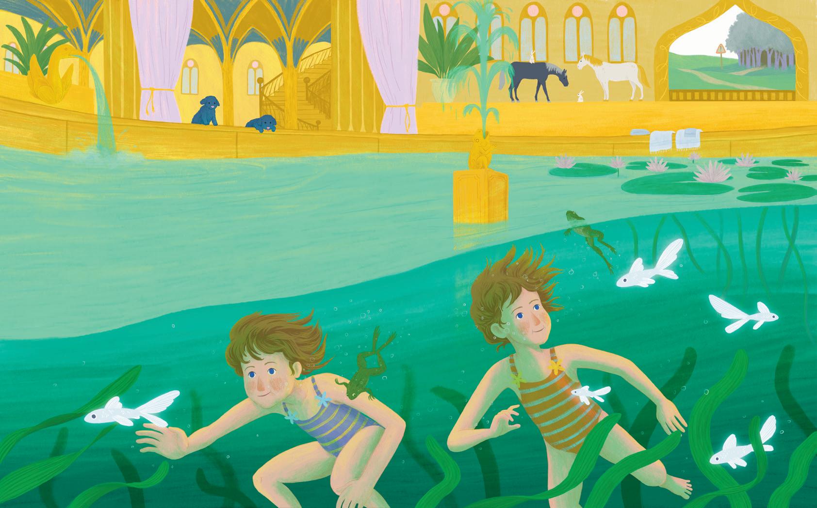 Non avete idea di quanto sia bello il Salone Dorato. Le pareti risplendono d’oro e in mezzo c’è una fontana con l’acqua verdissima dove spesso Lilla-li e io facciamo il bagno. Dopo aver dato da mangiare ai conigli abbiamo deciso di andare a fare una cavalcata. Il cavallo di Lilla-li è bianco, con la criniera e gli zoccoli d’oro. Il mio cavallo è nero, con la criniera e gli zoccoli d’argento. Piè d’Oro e Piè d’Argento, così si chiamano i nostri cavalli.