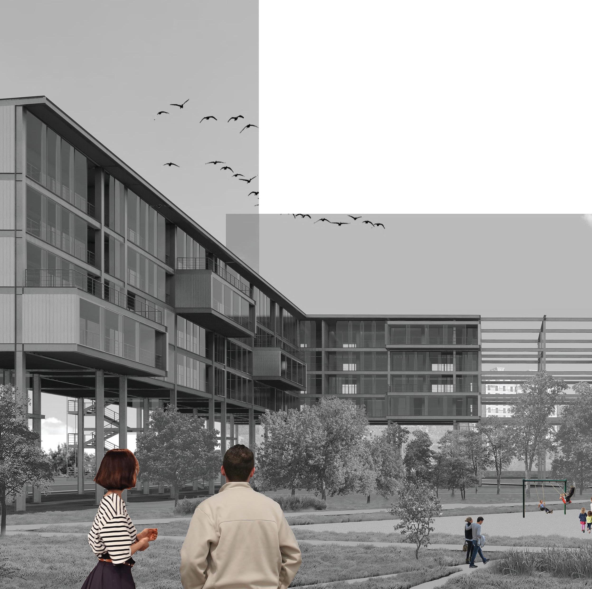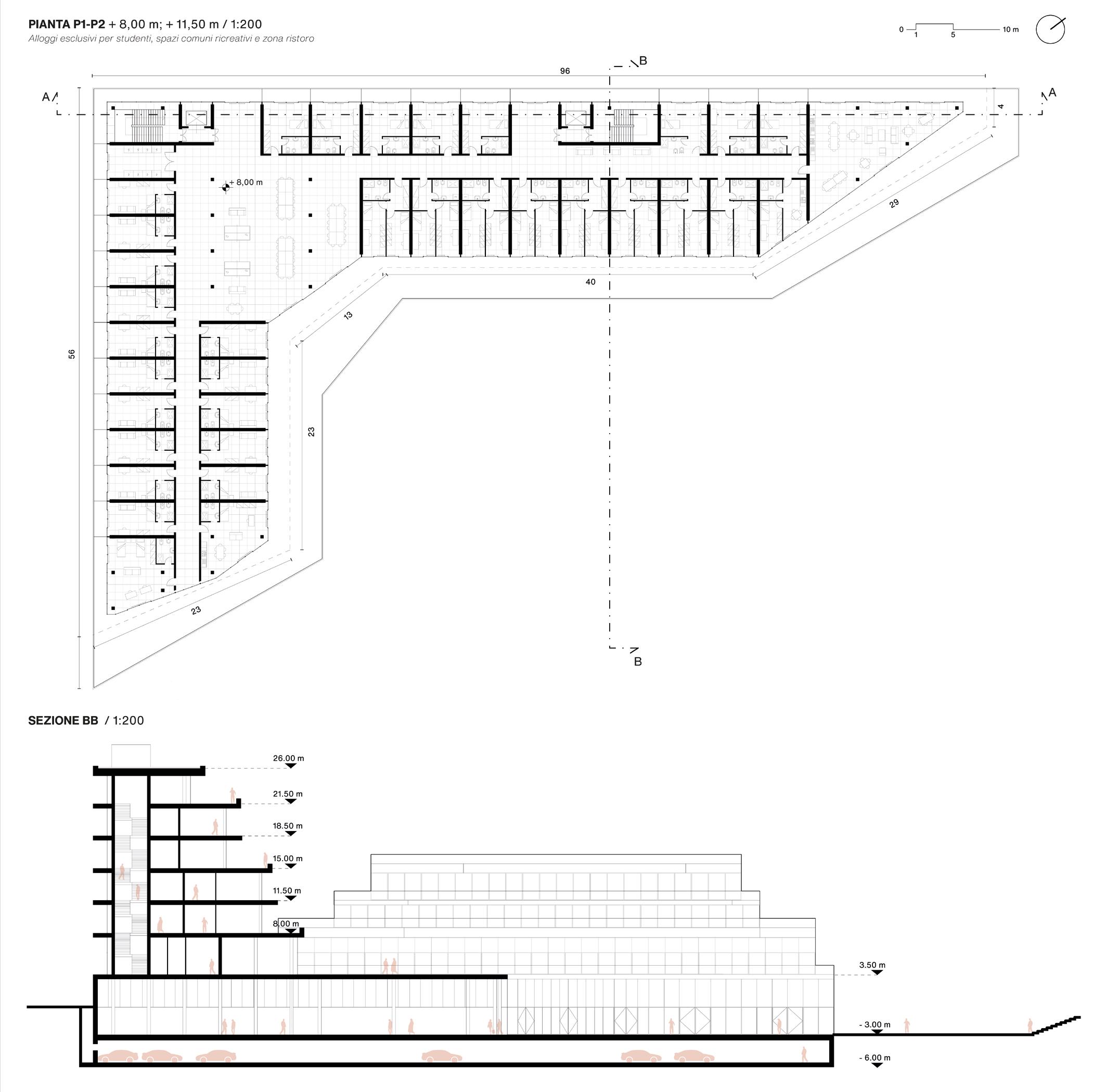 A stabilire una geografia interna sono poi gli edifici dedicati a student-housing, facilmente individuabili per il loro volume sensibilmente più grande e per ‘eccentricità del loro rivestimento. Questi grandi parallelepipedi rivestiti da scuri regolabili oltre a fungere da /andmark offrono la possibilità a giovani studenti fuori sede di affittare una residenza e godere del teatro sociale e della contaminazione culturale del territorio di riconnessione.