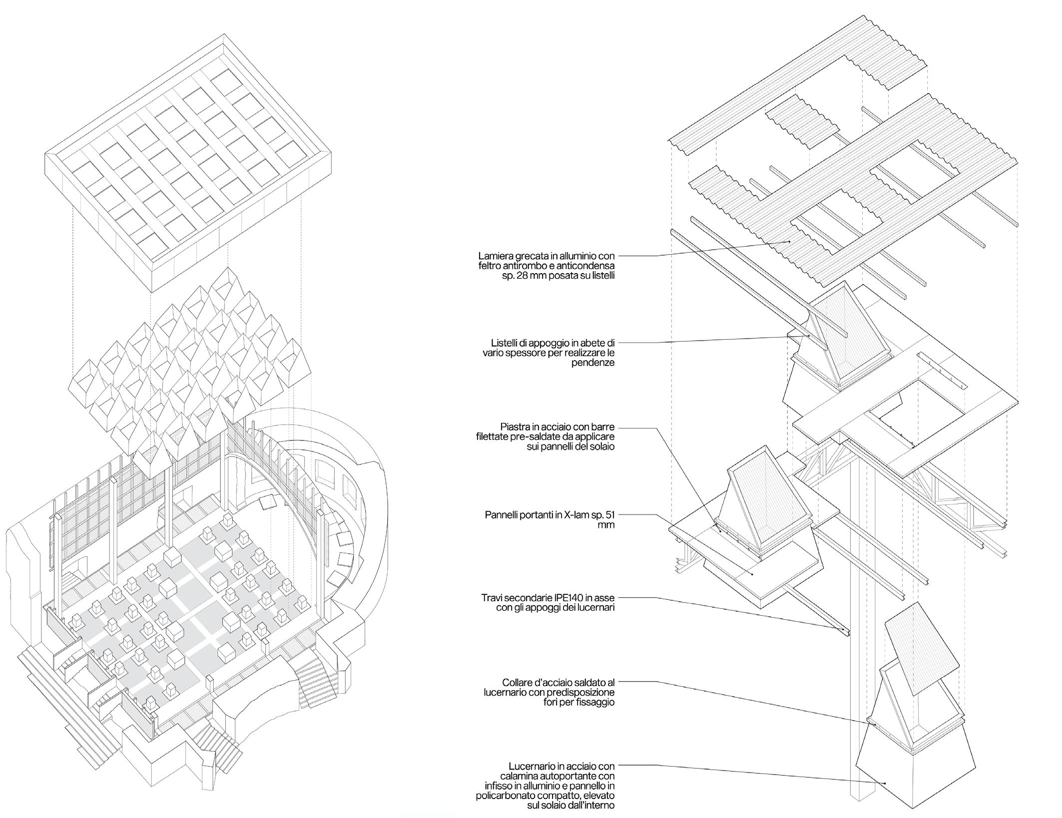Esploso assonometrico tecnologico del sistema di copertura a lucernari