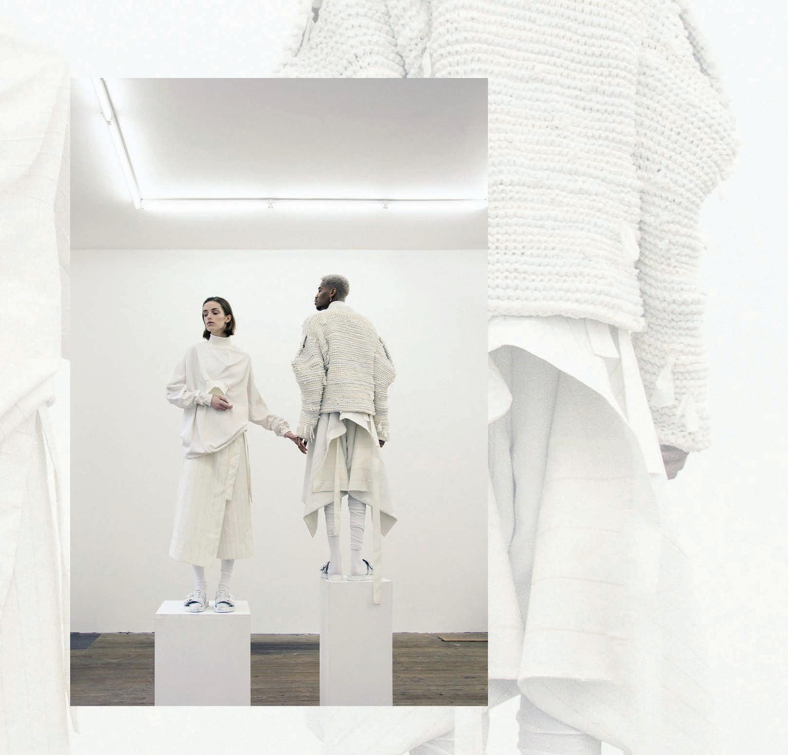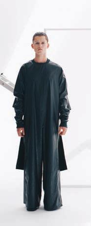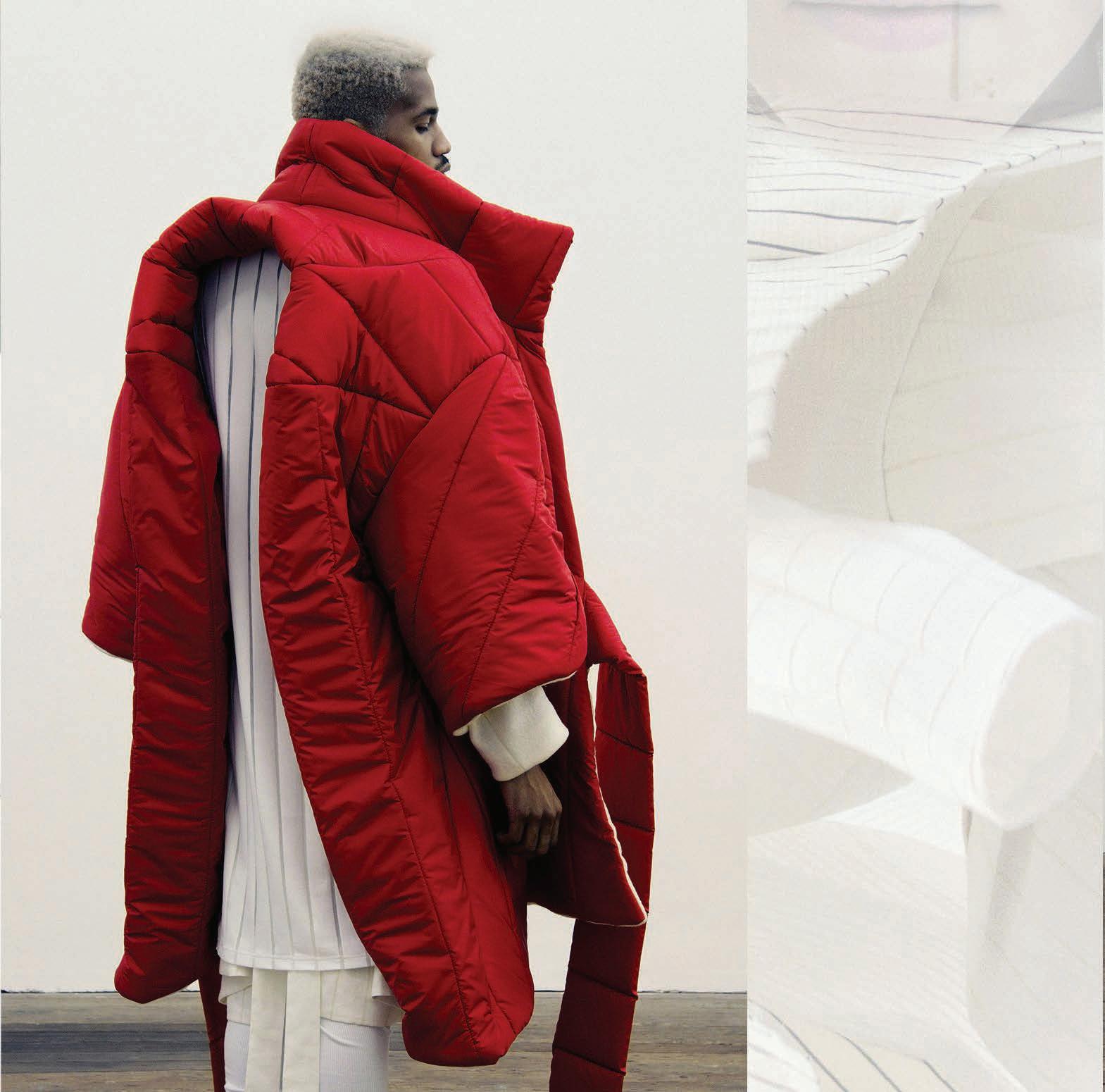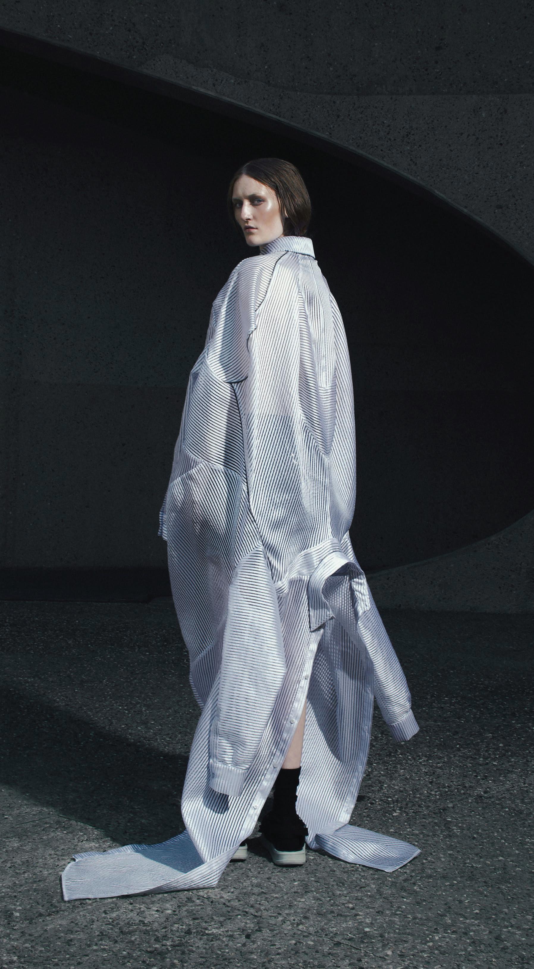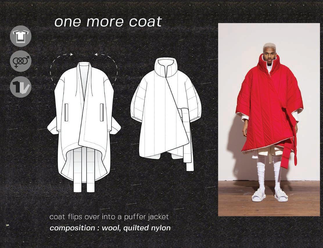 garments that adapt to several physiques bottoms that wrap and fold around the wearer, bulbous silhouettes, extended or softened shoulders. All in one size.