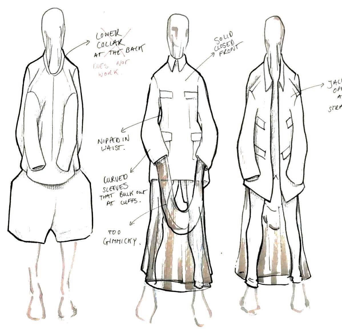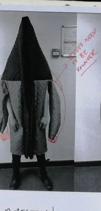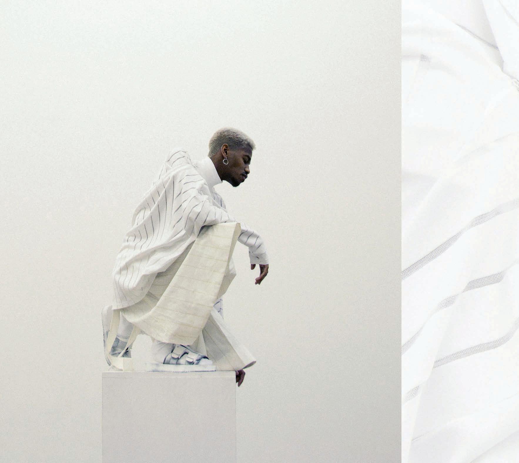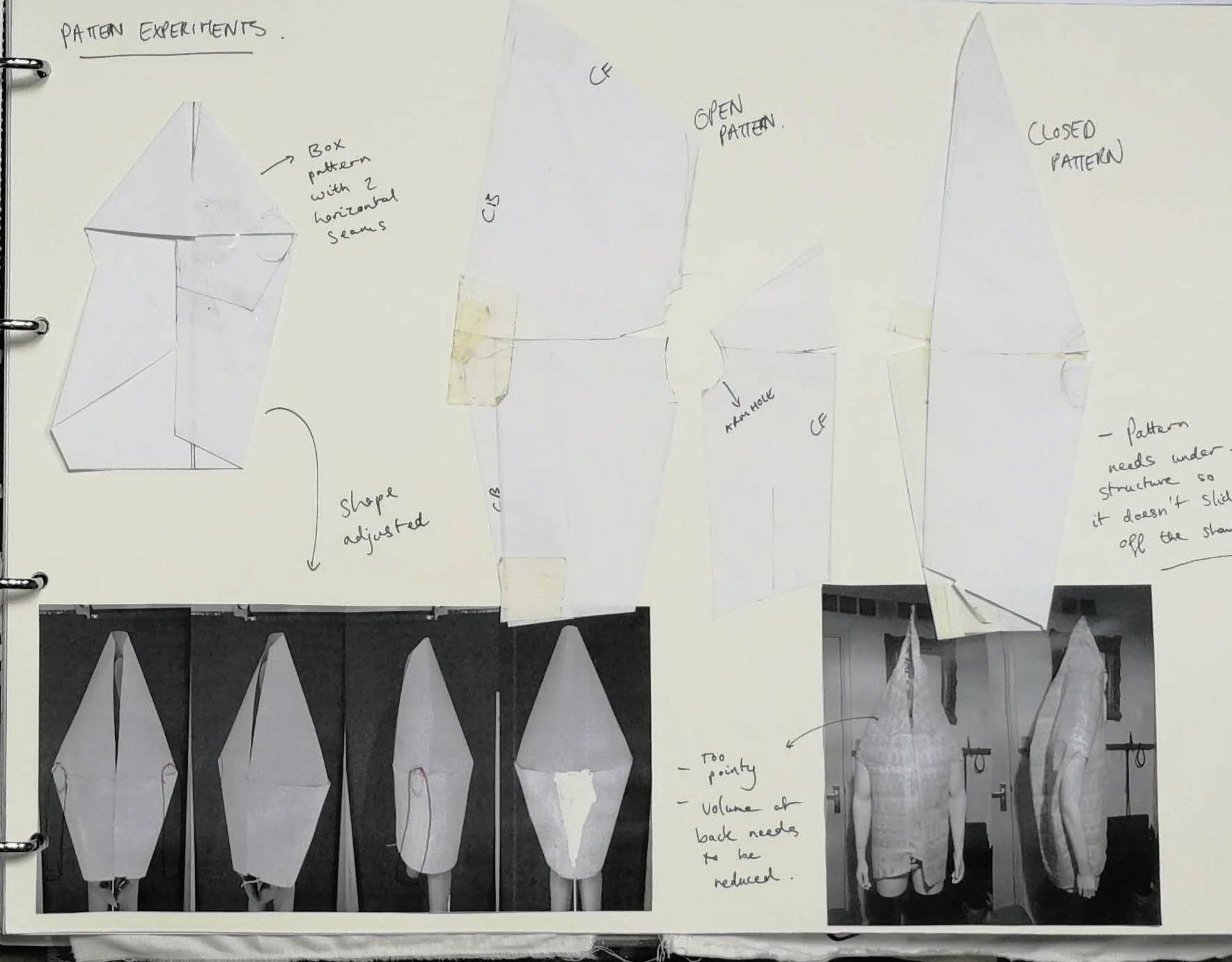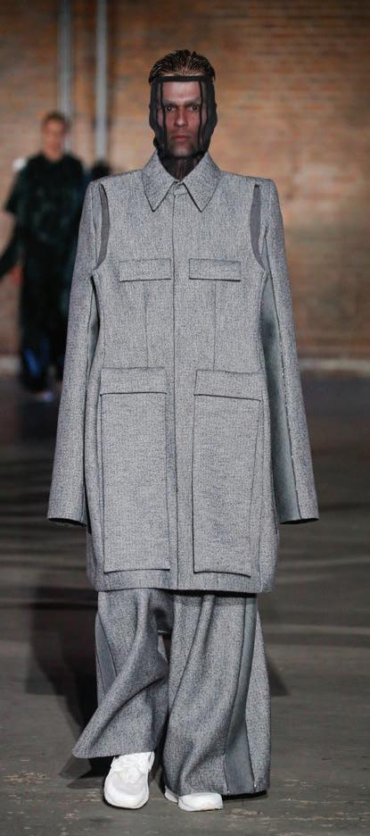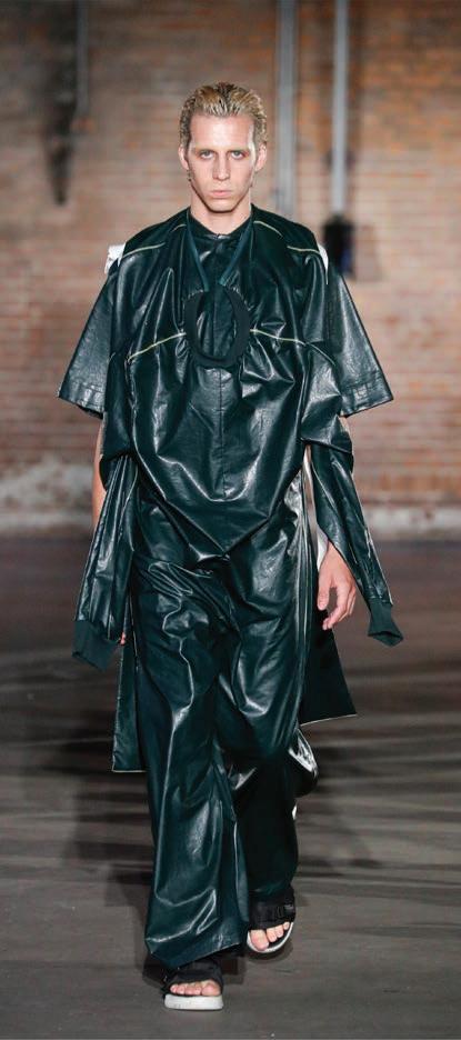 garments that adapt to several physiques bottoms that wrap and fold around the wearer, bulbous silhouettes, extended or softened shoulders. All in one size.