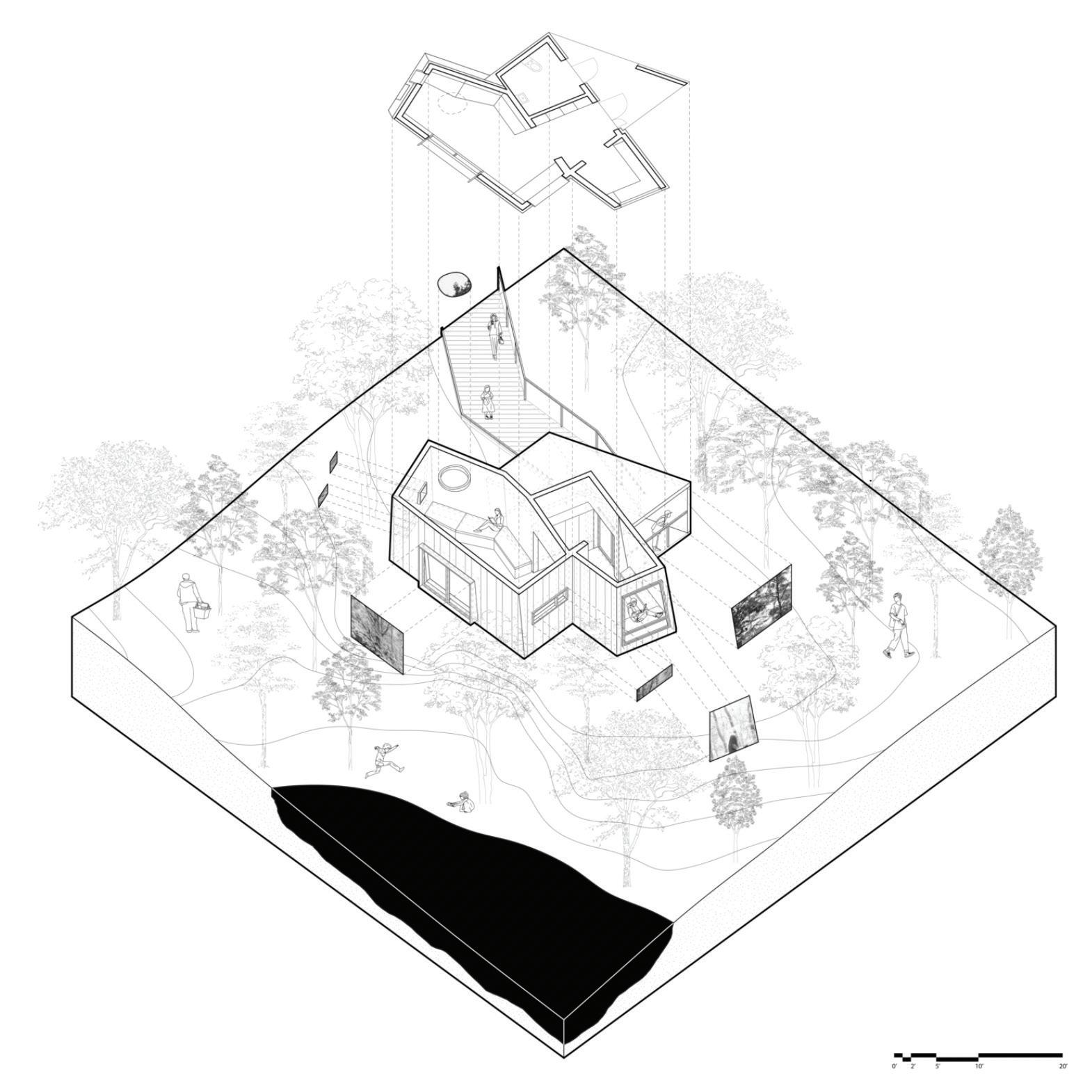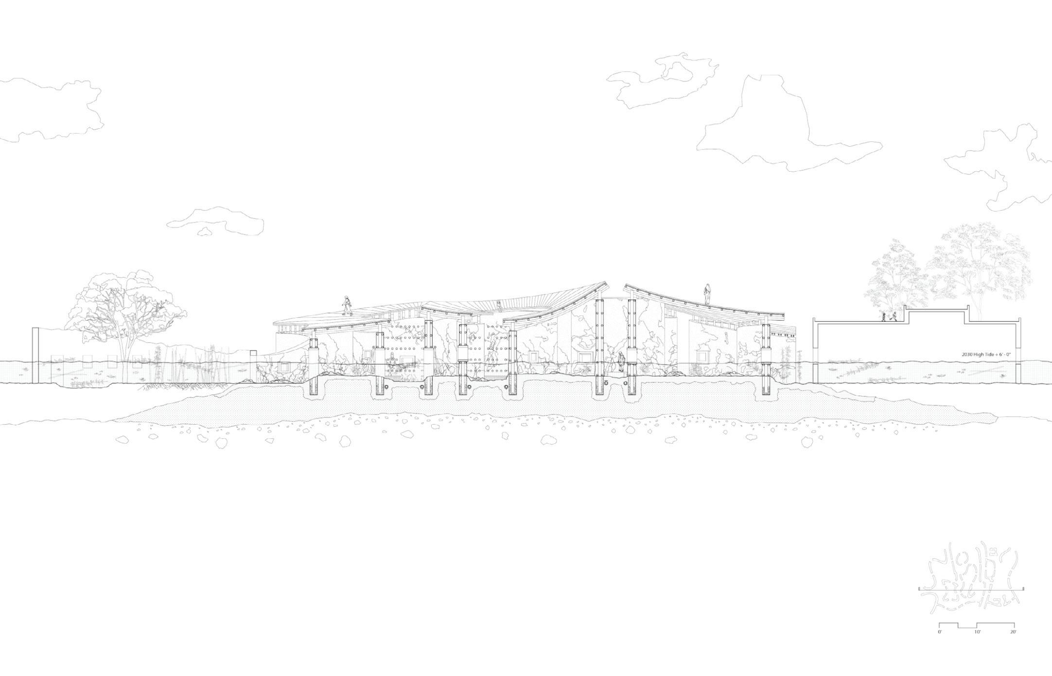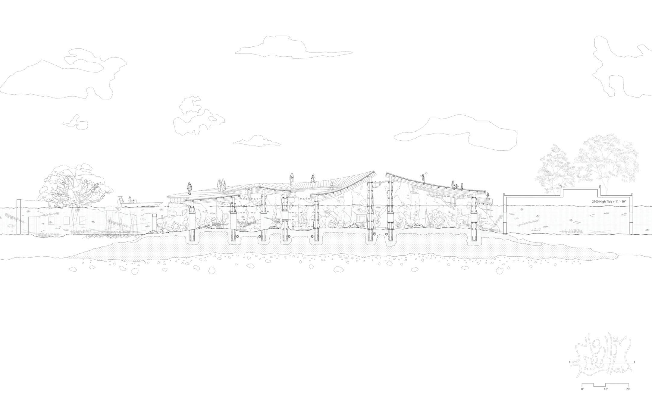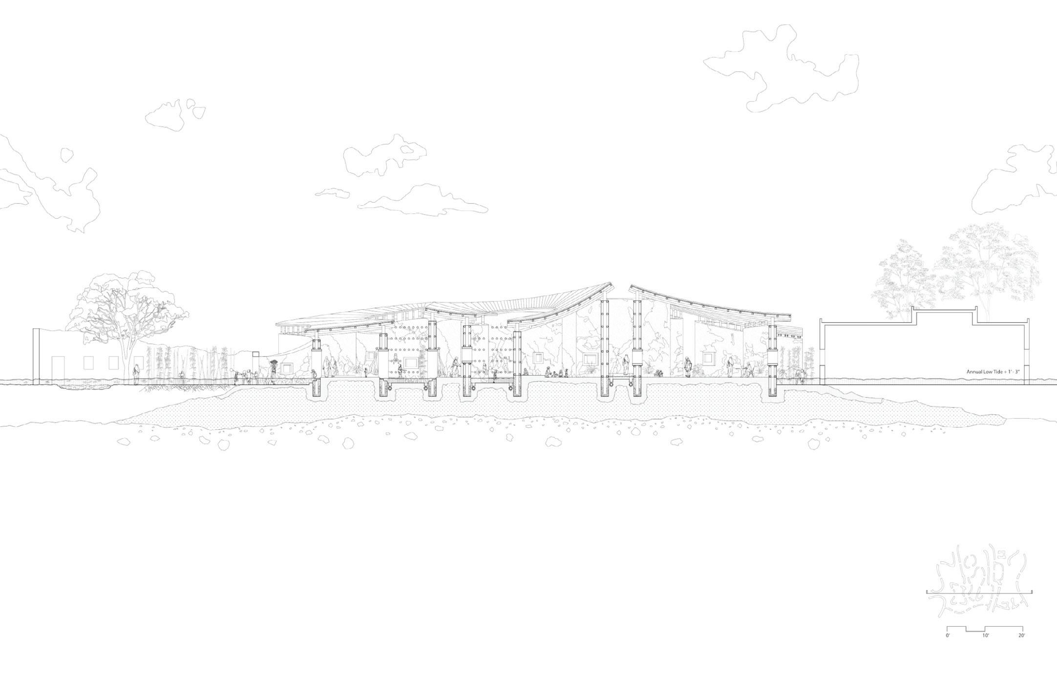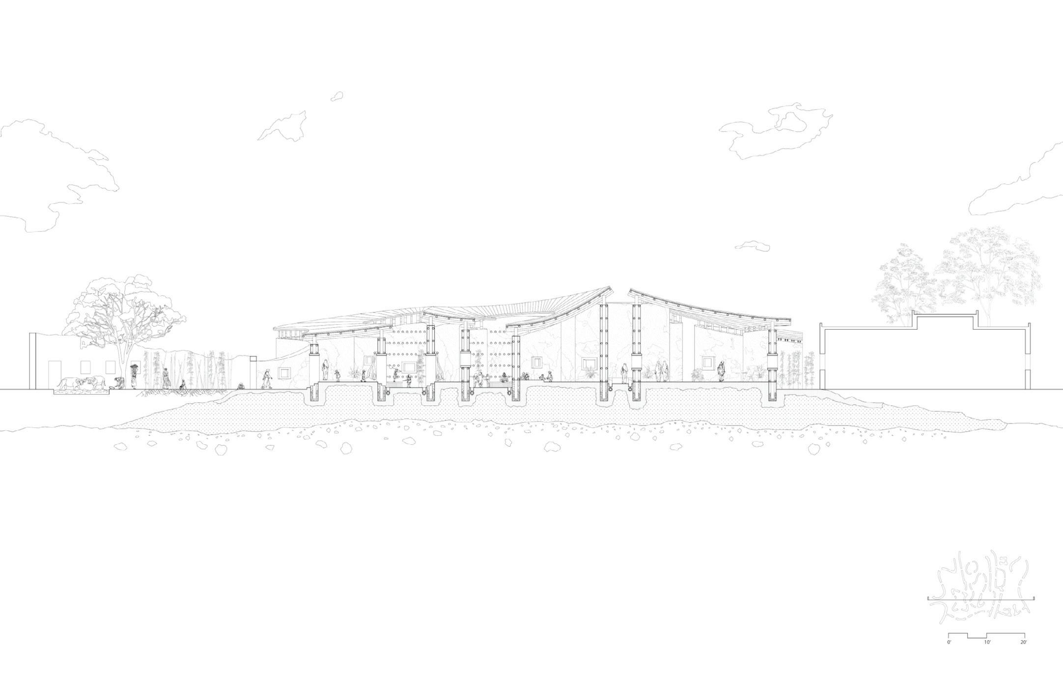 This project examined the potential of mud and bamboo construction, the interaction between a building and the earth, and the varying levels of the water table. The concept was that mud, a substance that decomposes naturally and hence necessitates ongoing maintenance, could be a tool for collectivity and participatory design.
