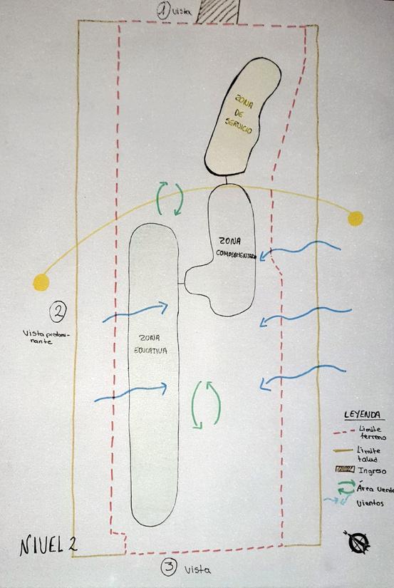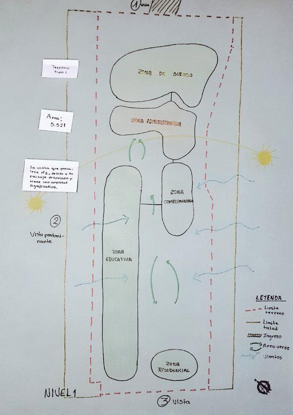 Se sugiere aprovechar y hacer áreas verdes en el terreno para fomentar la interacción entre los estudiantes. Además de hacer un acceso vehicular y uno peatonal.