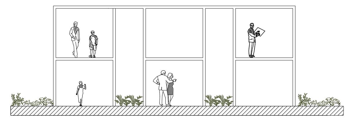La estructura cuenta con doble altura y permite la interacción en ambos pisos. Además, se abre el espacio para instalar huertos y aprovechar la exposición al sol y la ventilación.