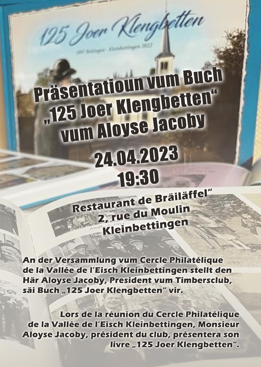 CSV Stengefort 24. Een Trëppeltour a Gesellschaft Eischen, rdvs Mairie 14h30 Commission du 3e âge 24. Buchpresentatioun „125 Joer Klengbetten“ Restaurant de Bräiläffel (19h30) Cercle Philatélique de la Vallée de l’Eisch Kleinbettingen 29 Ceratizit Festival Elsy Jacobs Steinfort Sport a Fräizäit Zéisseng 29. Soirée France Steinfort FC Stengefort