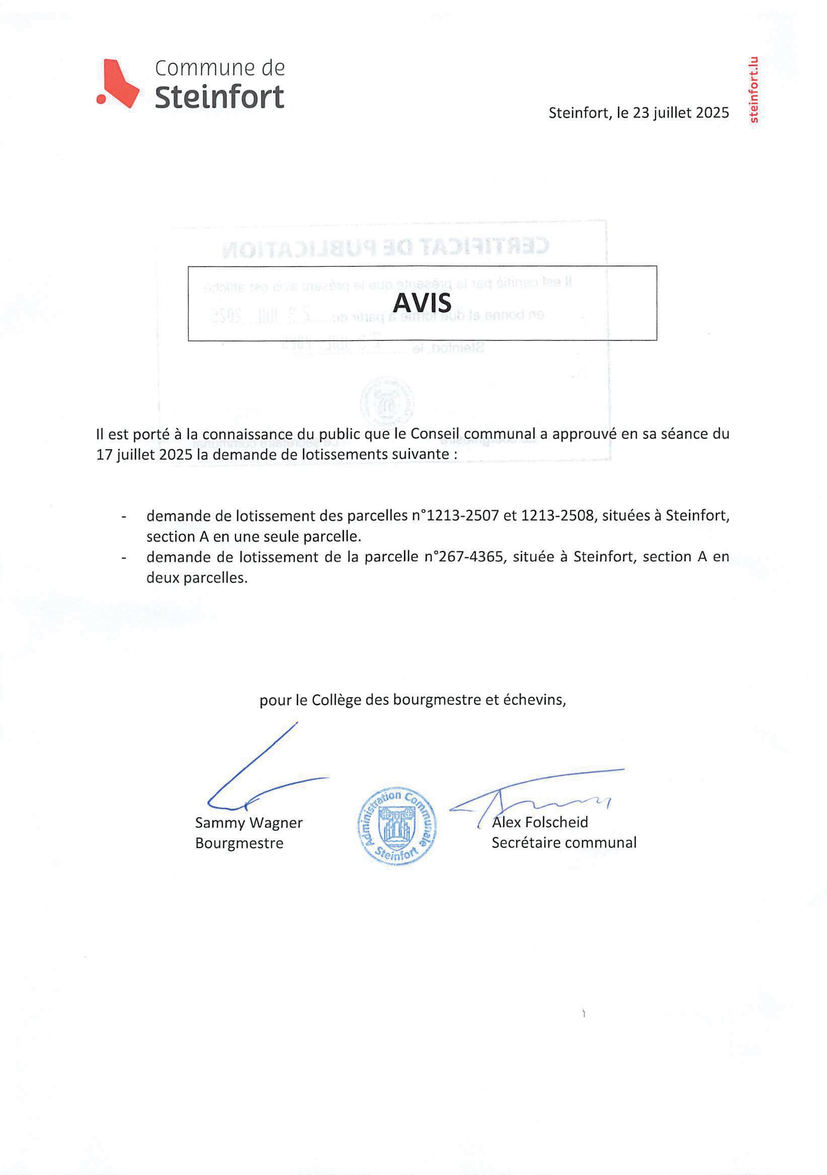 Le Conseil communal décide unanimement d’approuver l’acte notarié 12900 dressé par Maître Jacques CASTEL de Capellen en date du 16 septembre 2025, portant sur la cession gratuite au profit de la commune de Steinfort, de la parcelle 201/4535, place voirie, contenant 00,55 are et d’intégrer ladite parcelle dans le domaine public communal.