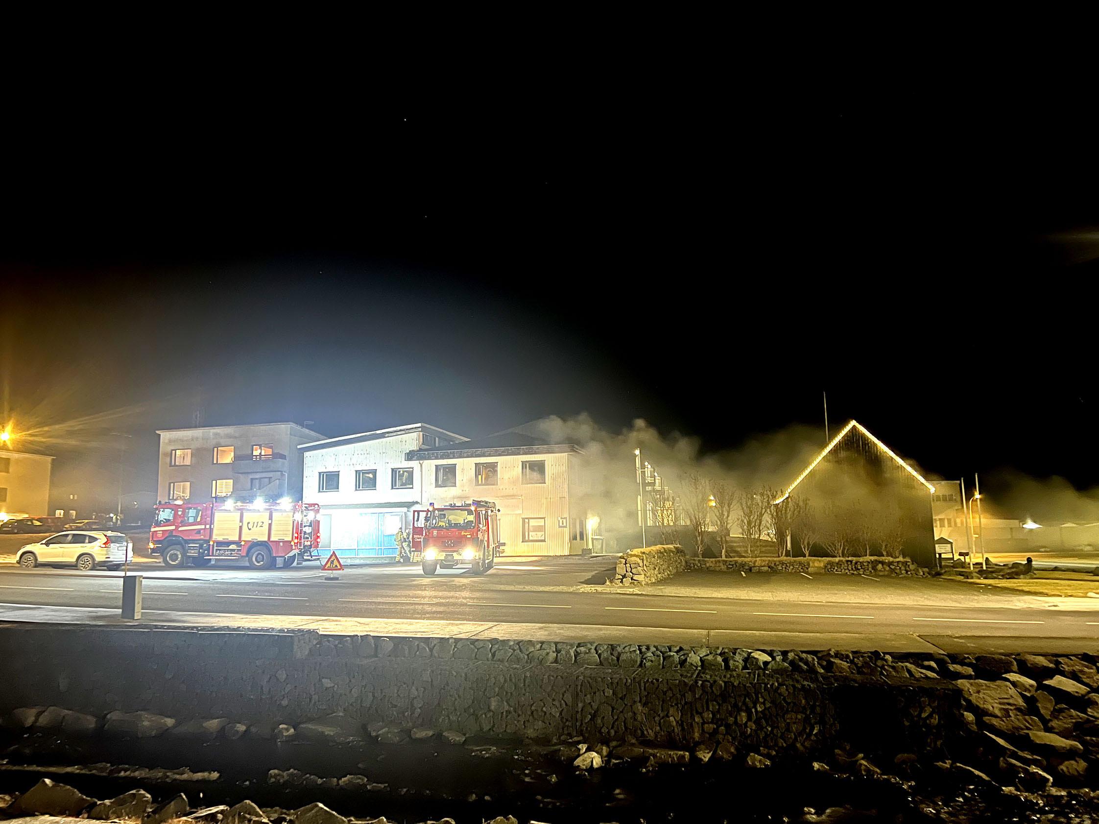 Blaðamaður náði þessari mynd á meðan æfingin stóð yfir en sjá má tvo bíla slökkviliðsins og reykinn sem liggur út úr Átthagastofunni.
