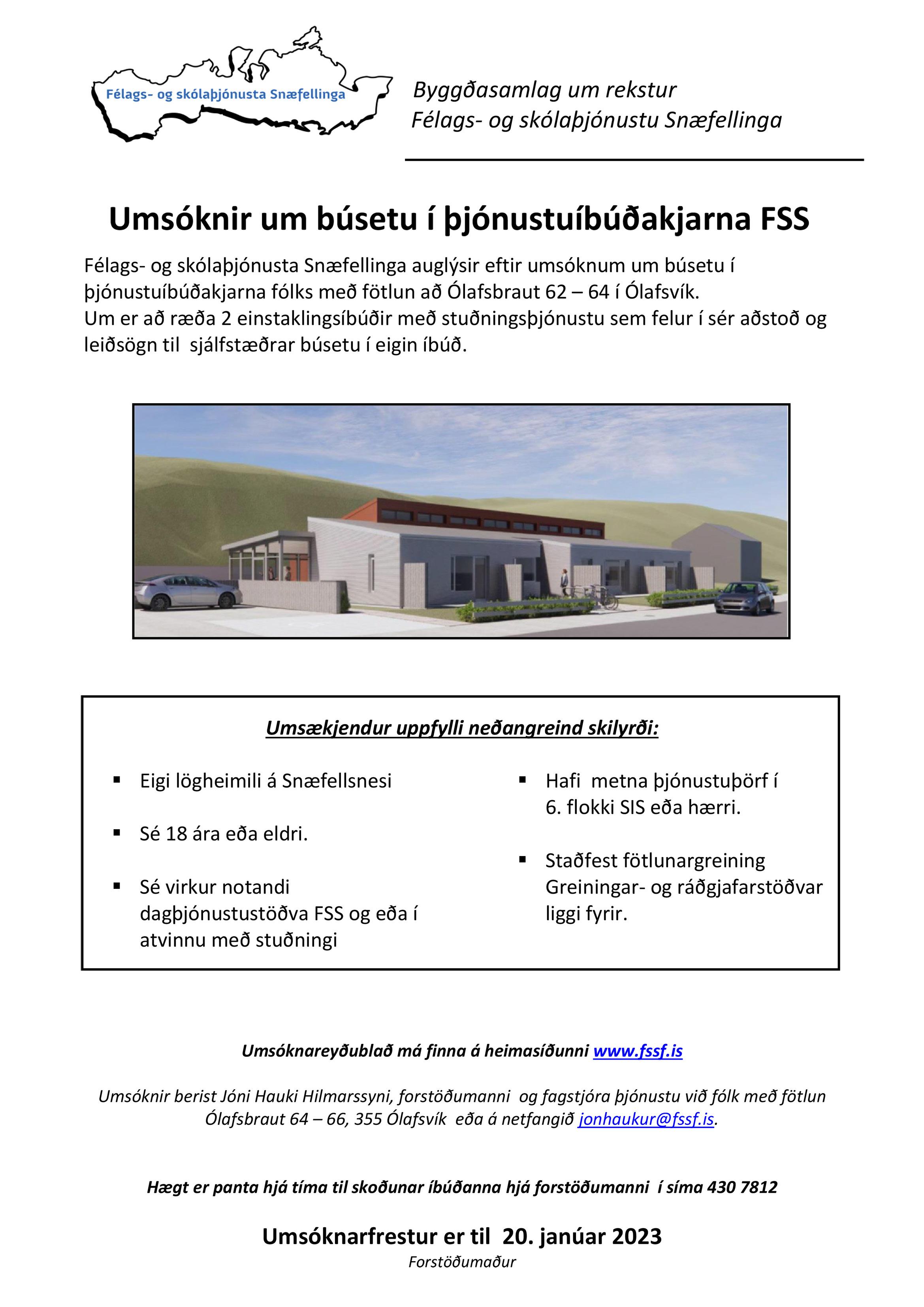 Frekari upplýsingar um starfið veitir næsti yfirmaður verkefnisstjóra, Ingveldur Eyþórsdóttir, yfirfélagsráðgjafi FSS, ingveldur@fssf.is; s. 430 7800