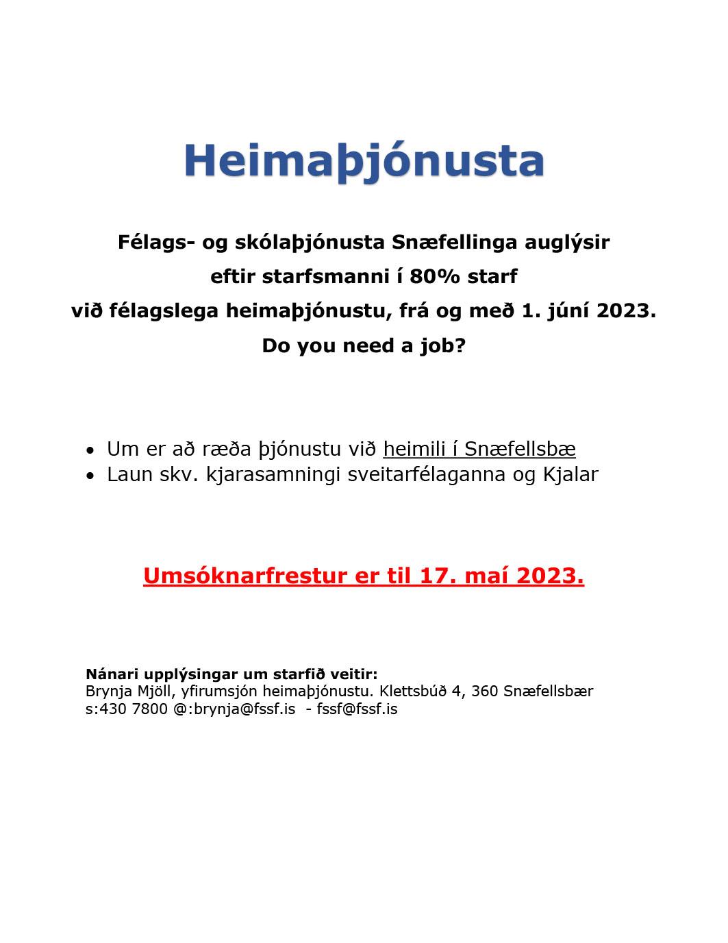 Skriflegar umsóknir er tilgreini menntun og fyrri störf ásamt sakavottorði og nöfnum 2ja umsagnaraðila berist á skrifstofu Smiðjunnar Ólafsbraut 19, 355 Ólafsvík eða á netfangið thorheidur@fssf.is