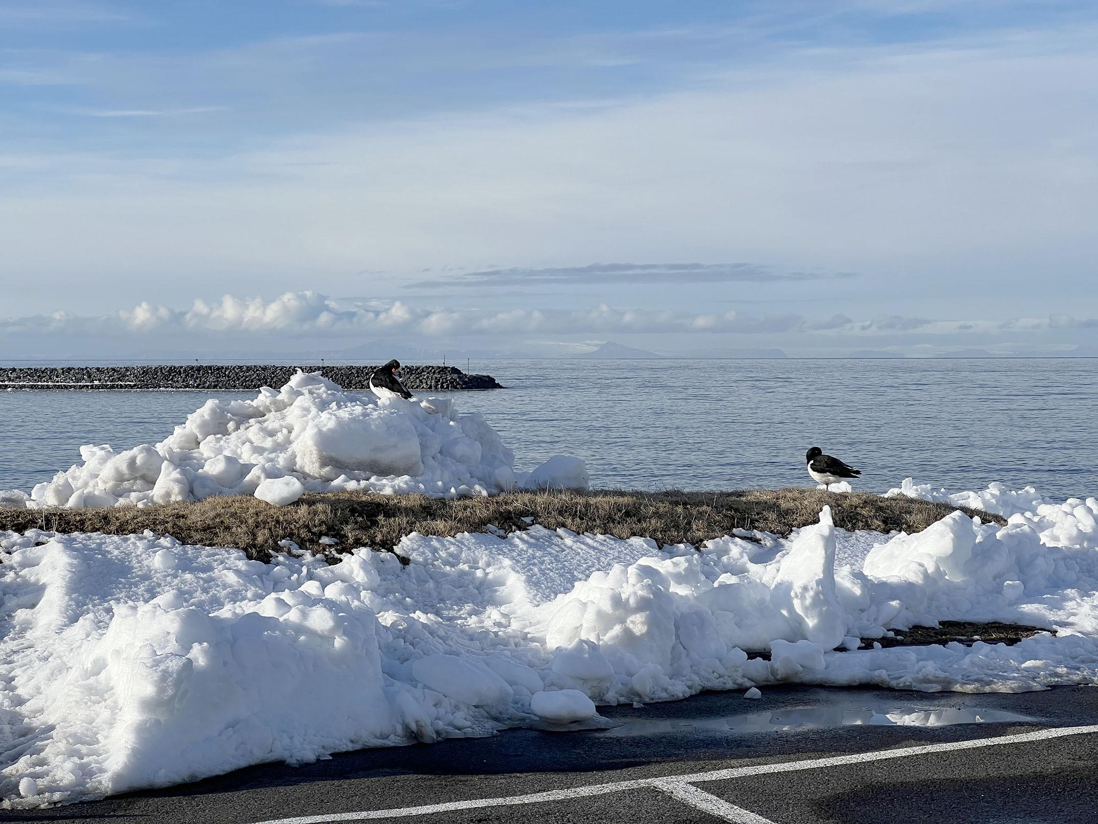 snjór þekur jörð og hitastig er nálæt frostmarki, tjaldarnir tveir sem myndin er af voru á vappi við félagsheimilið Klif á þriðjudag, þeir eru vanir að verpa á Klifinu og hafa hugsanlega verið að undrast um hvar hreiðurstæðið geti verið.