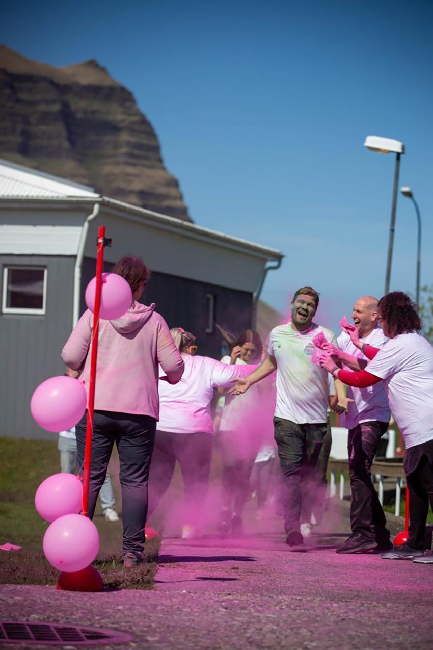 geirs, Grundarfjarðarbæjar og Kaffi 59. Hlaupið hófst á upphitun á skólalóðinni þar sem Viktoría Sigurðardóttir, söng- og leikkona, stóð fyrir upphitun og svo hlupu ungir sem aldnir af stað í skemmtilega hlaupabrautina. Þátttakendur komu í mark í öllum regnbogans litum eftir að hafa þrætt braut-