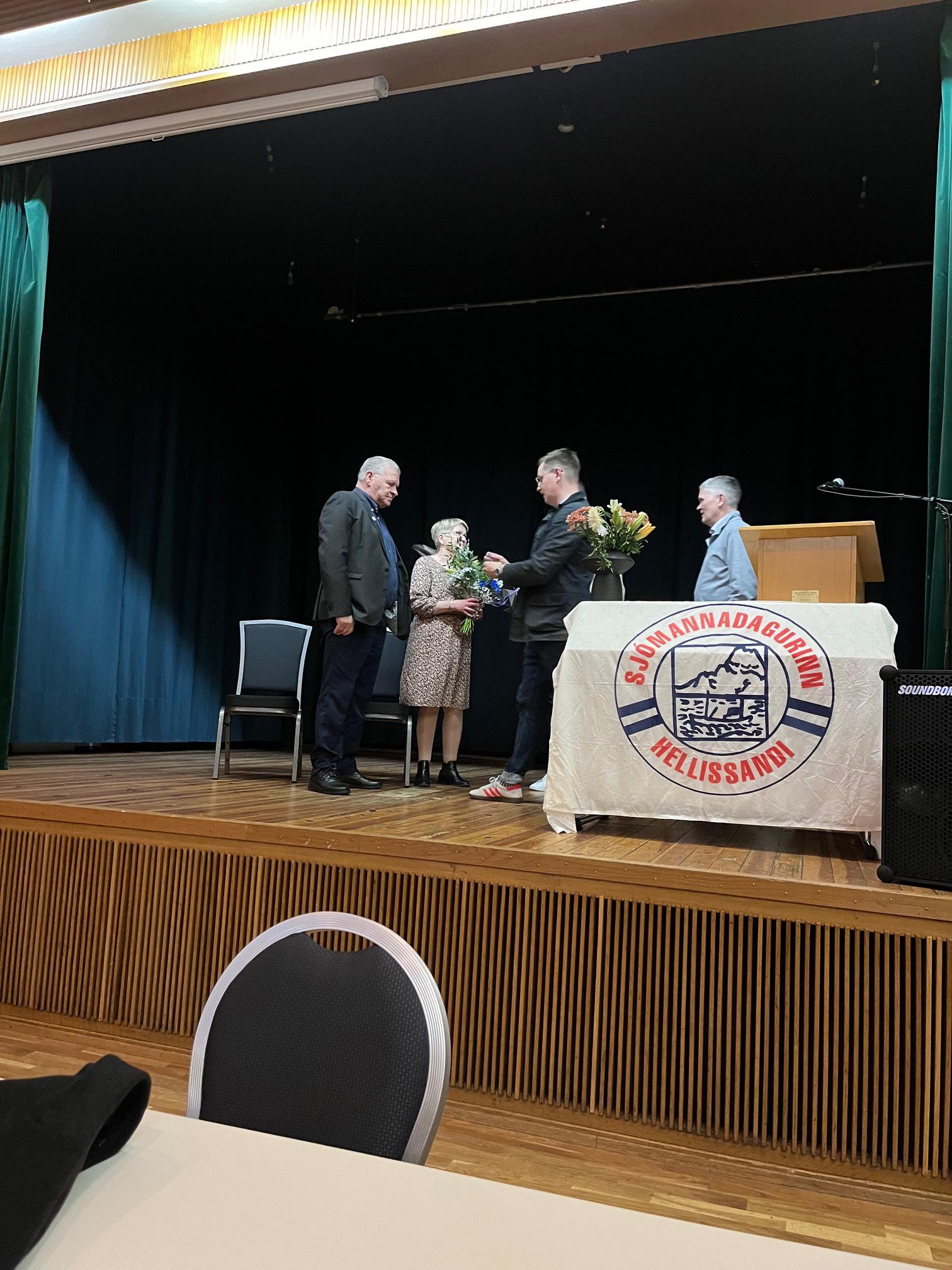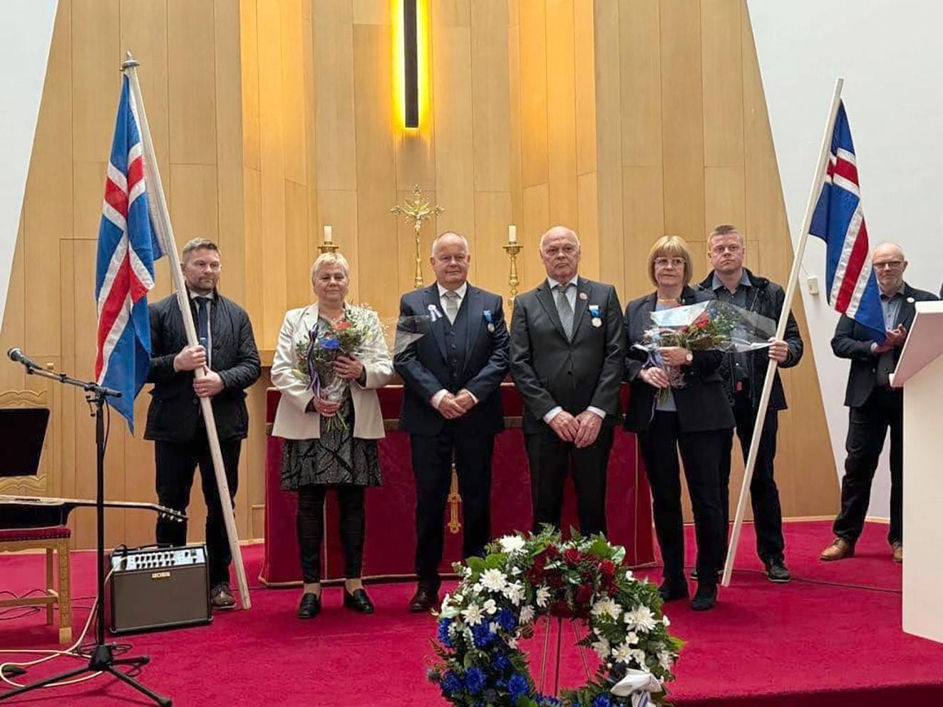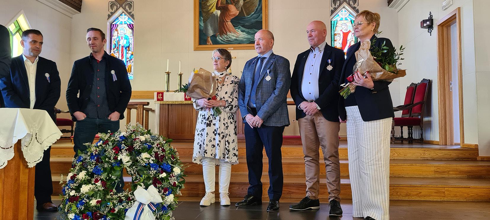 Ingi Þór og Páll Guðfinnur Guðmundssynir, fyrrum sjómenn, ásamt eiginkonum sínum, þeim Hjördísi Hlíðkvist Bjarnadóttur og Guðbjörgu Hringsdóttur, voru heiðruð fyrir störf sín og sæmd heiðursmerki sjómannadagsráðs Grundarfjarðar. Að messu lokinni var svo athöfn við styttuna Sýn þar sem blómakrans var