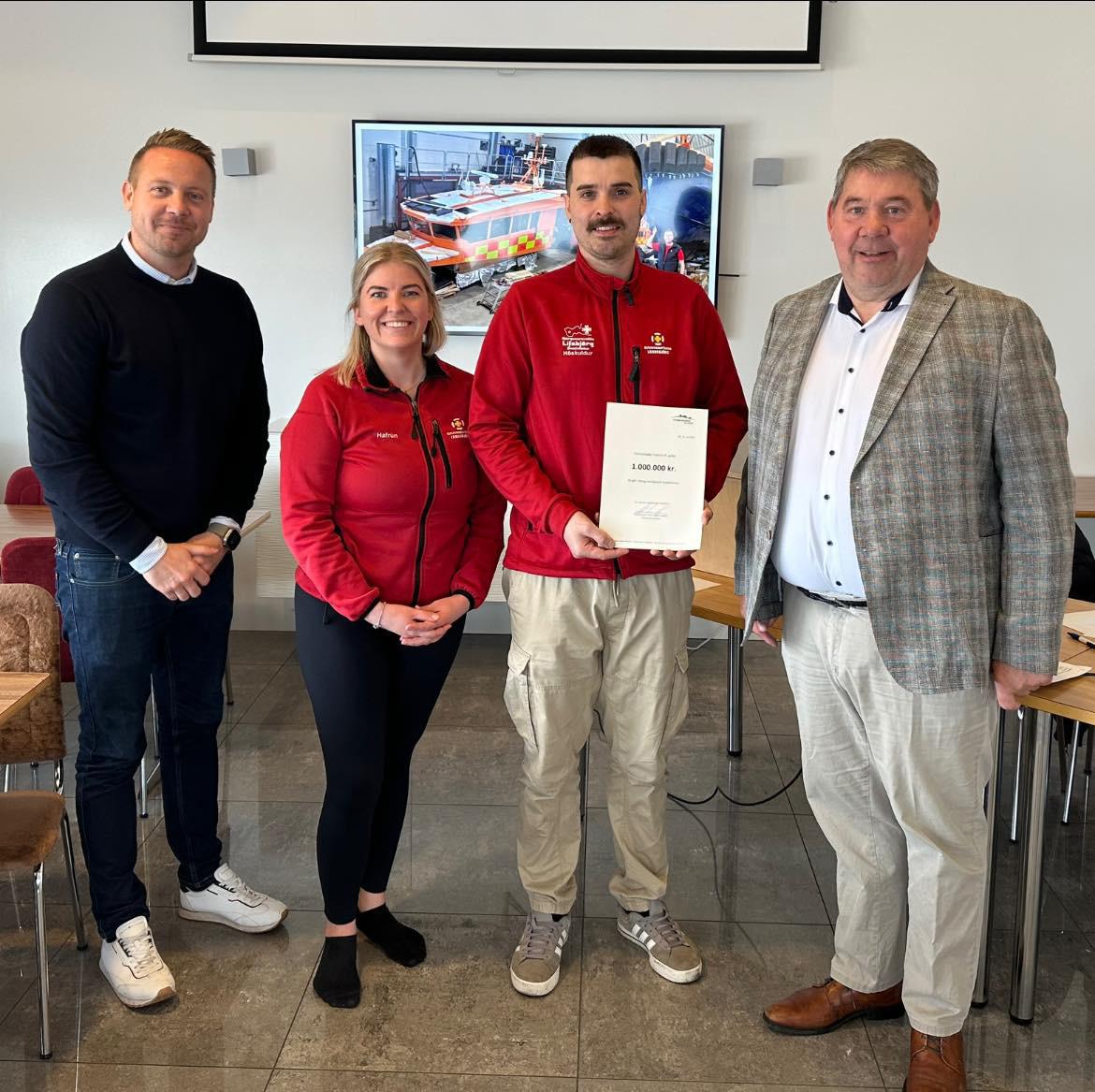sjóð Snæfellsnes peningastyrk til nýsmíðarinnar. Í síðustu viku afhenti Fiskmarkaður Íslands sjóðnum veglegan styrk upp á 1.000.000 krónur til kaupa á bátnum en styrkurinn var veittur á aðalfundi Fiskmarkaðs Íslands í björgunarstöðinni Von á Rifi. Á meðfylgjandi mynd eru Ragnar Smári Guðmundsson, framkvæmdastjóri Fiskmarkaðs Íslands, Hafrún Ævarsdóttir, ritari Lífsbjargar, Höskuldur Árnason, formaður Lífsbjargar og Guðmundur Smári Guðmundsson, stjórnarformaður Fiskmarkaðs Íslands.