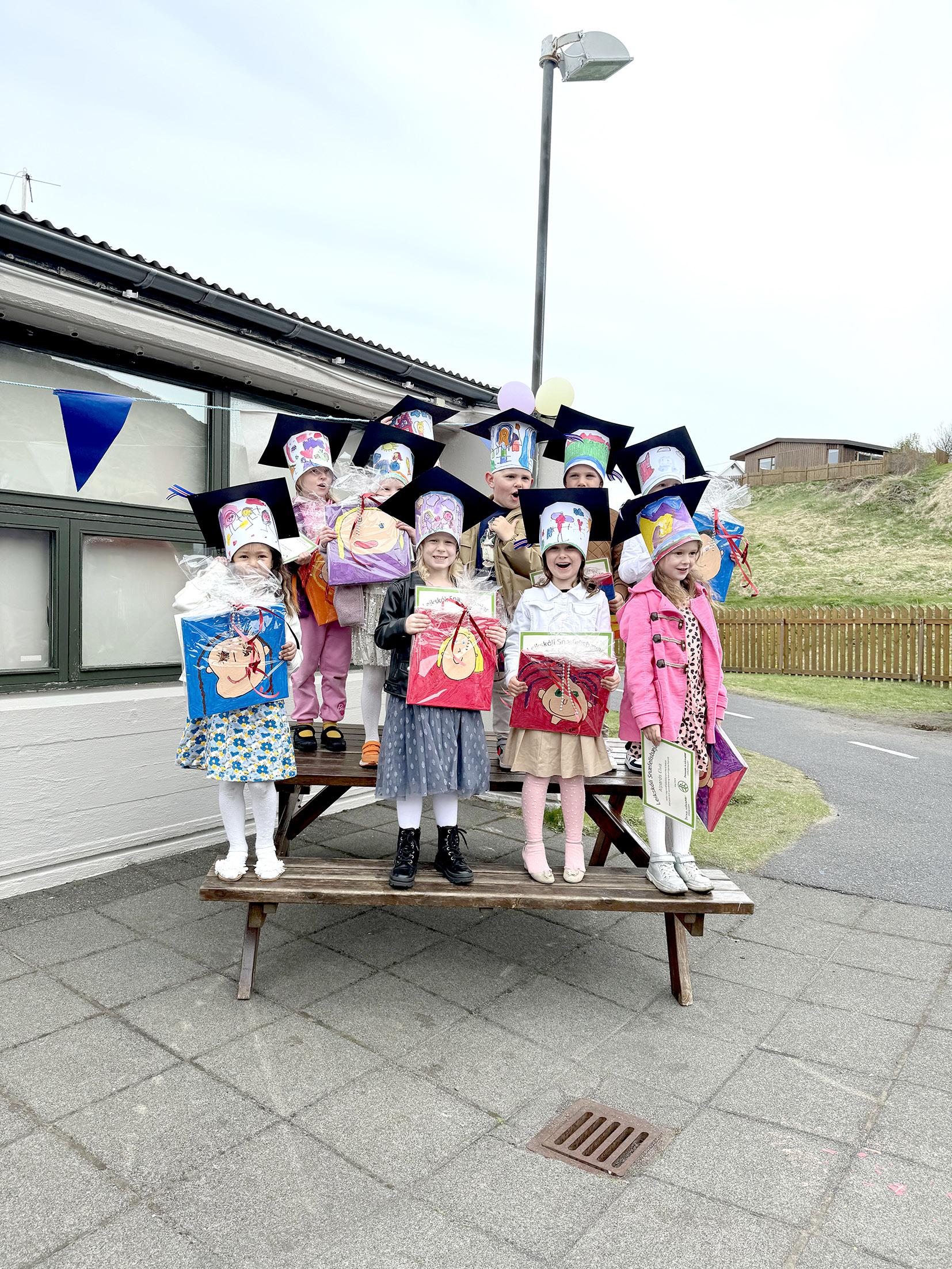 inni lokinni var boðið upp á grillaðar pylsur og skúffuköku. Gestum gafst svo tækifæri til að skoða sig um á leikskólunum og sjá afrakstur vetursins. Ómar Lúðvíkson gaf leikskólanum Kríubóli gjöf í tilefni þess að barnabarn hans, Harpa Guðný Aradóttir, var að ljúka námi við leikskólann og tók Hermína Lárusdóttir, leikskólastjóri, við tveimur settum af kubbum frá honum. Annars vegar 120 kubba sett, 12 fígúrur sem samanstanda úr 72 hringjum og 36 penignum og hins vegar 72 hluta kubba sett. Ótrúlega margir möguleikar eru í boði með báðum settunum en þetta er allt úr