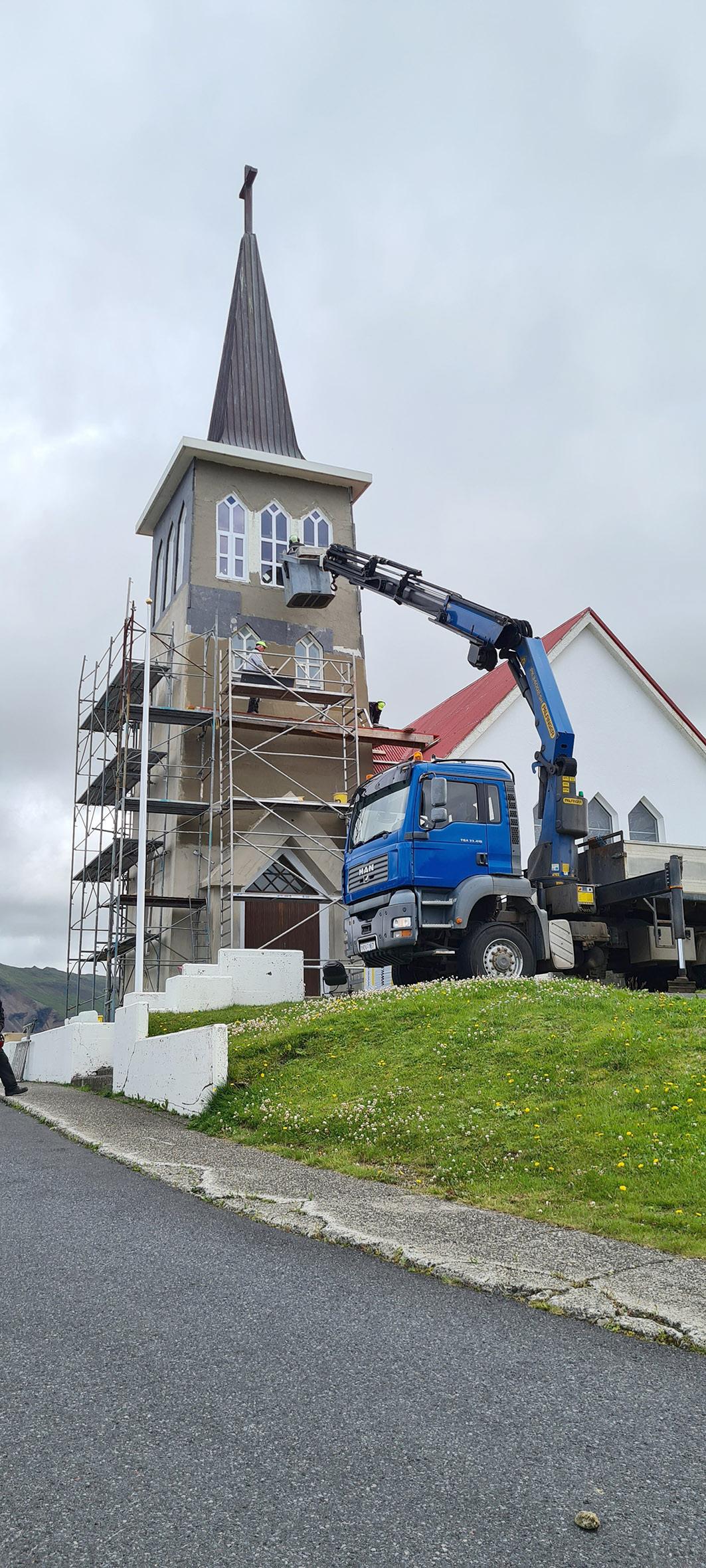 Grundarfirði standa nú yfir en verkið er framhald á viðhaldi á kirkjunni sem farið var í fyrir þremur árum. Þorkell Gunnar Þorkelsson, múrarameistari, sér um verkið en byrjað er á að múra húsið til að vatnsþétta, svo er sett einangrun og að lokum múr eða stoðkerfi sem er þá veðurkáp an. Fyrir þremur árum var far