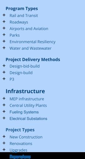 At the heart of our offering lie our core proficiencies in project, program, and construction management. From a project’s inception through its completion, our seasoned experts navigate every phase with precision, ensuring that infrastructure authorities' objectives are not only met but exceeded. We thrive on complex challenges and are adept at orchestrating large-scale projects that drive the infrastructure forward.