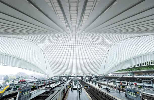 When we designed the 35-metre high Liège Guillemins station, we knew that disrupting the trains would be out of the question. So, instead of using a crane to construct the main part of the dome, we opted for a far more rapid, timeefficient solution – we pre-assembled five steel arches at a time and pushed them into place from a temporary platform at the front of the station. This allowed us to assemble a roof structure of 4,500 tonnes with zero disruption to the railway. We could only accomplish this kind of feat using steel. It was an impressive sight. We used a similar method for the spectacular Millau Viaduct in southern France.