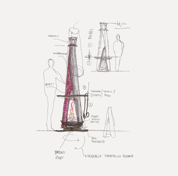 Un mantello metallico (verniciato o Cor-Ten) contiene e avvolge come un veste il fuoco e canalizza i fumi nella parte superiore. Lo spillone che allaccia la veste regola il tiraggio attraverso la movimentazione di una valvola per i fumi.