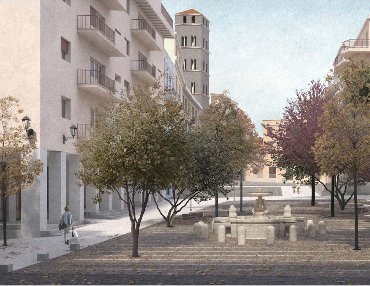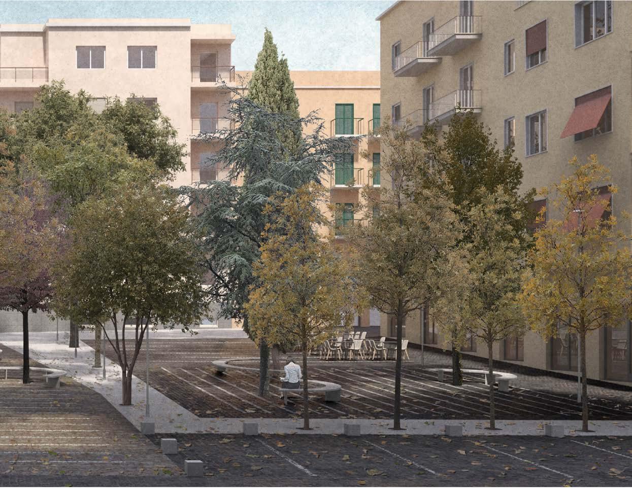 La piazza è un vuoto urbano, centrale, che si presenta come un melting pot di emergenze sconnesse di difficile lettura. La presenza di elementi rilevanti dal punto di vista storico, come la Torre del Trivio, la fontana del Rainaldi, ad oggi risultanti del traffico, non ha forza di generare aggregazione. Il progetto nasce dalla volontà di unificare in un sistema eterogeneo le stratificazioni storiche, attraverso la creazione di “zolle” di pavimentazione nuova e di recupero, che funzionalizzano e mettono in relazione attività, persone ed elementi identitari. Questo nuovo “tappeto urbano”, totalmente accessibile, ha l’obiettivo di pedonalizzare la piazza e culmina in un pieno vegetale, inteso come estensione della adiacente Villa Ginetti, elemento che sintetizza territorialità, scenografia, sostenibilità e controllo climatico, identità.
