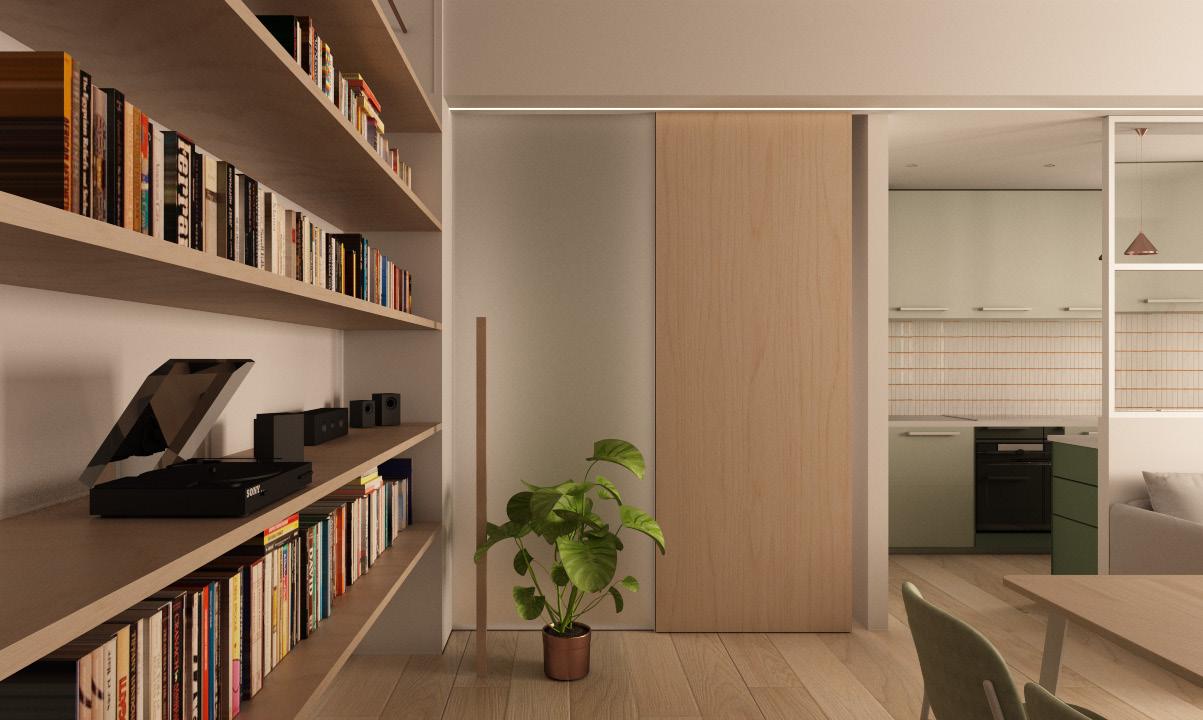 Le esigenze della committenza, insieme alle esigenze tecniche per l’accesso alle agevolazioni, si sono tradotte in un intervento di riqualificazione energetica con impianto radiante a pavimento e deumidificatore canalizzato, e una nuova distribuzione degli spazi interni. Dal punto di vista architettonico, l’ obiettivo era quello di raggiungere un ambiente living senza divisioni, con la zona pranzo come filtro tra soggiorno e cucina, ampliata grazie alla realizzazione di un varco su muratura portante per avere continuità nello spazio e nella luce, protagonista dell’appartamento. Come elemento distributivo principale, è stato realizzato un volume in legno, una fascia che accoglie spazi di servizio quali ripostiglio e angolo lavanderia, e un pannello a tutta altezza da cui si accede alla zona notte.
