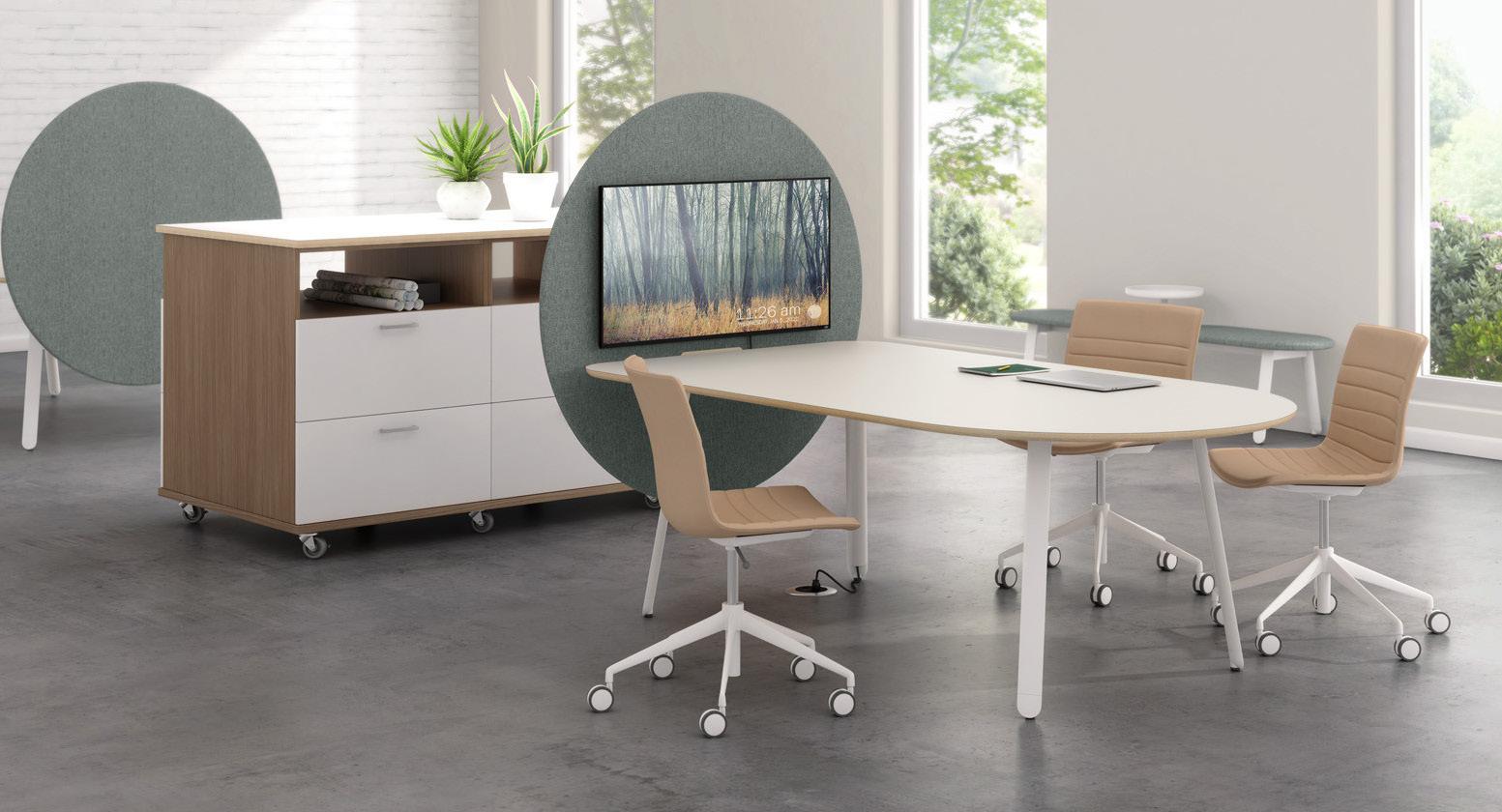 Watson: Bahn Work Island | Tonic Acoustic Panel Monitor Mounted Meeting Table Watson: Haven Multipurpose Table Watson: C9 Cart and GarageWork on the Move